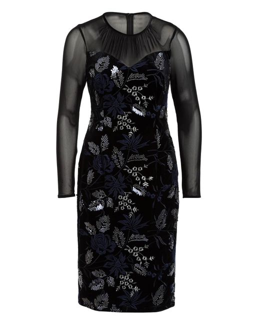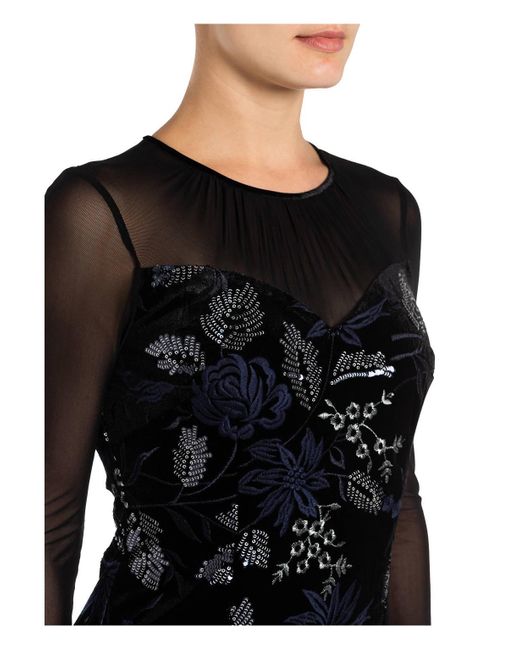 Rundhalsausschnitt. Aus Samt. Mit Paillettenbesatz. Florale Stitchings. Transparente Einsätze. Schließt mit nahtlosem Reißverschluss und Knopf im Nacken. Gefütterte Verarbeitung. Maße bei Größe 36:- Gesamtlänge ab Schulter: 104 cm- Brustweite: 86 cm- Taillenweite: 74 cm. Farbe: schwarz