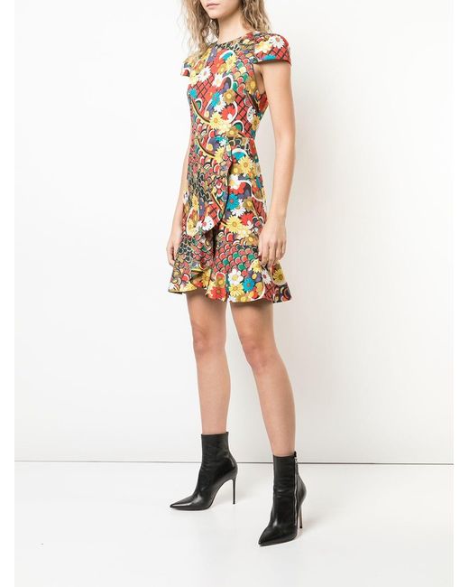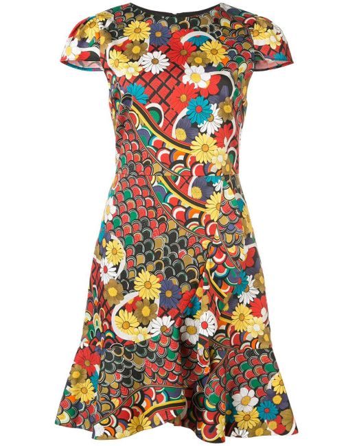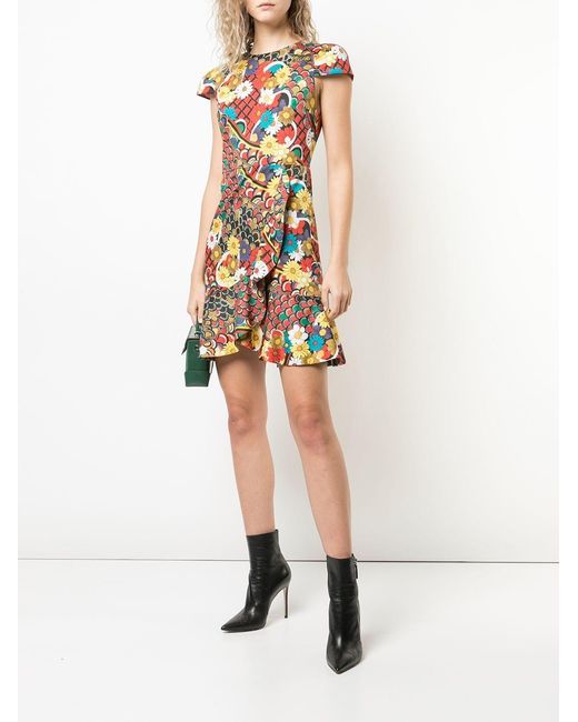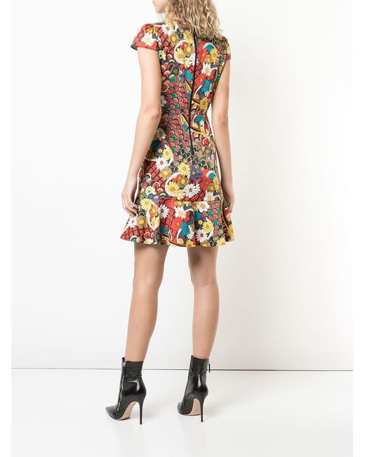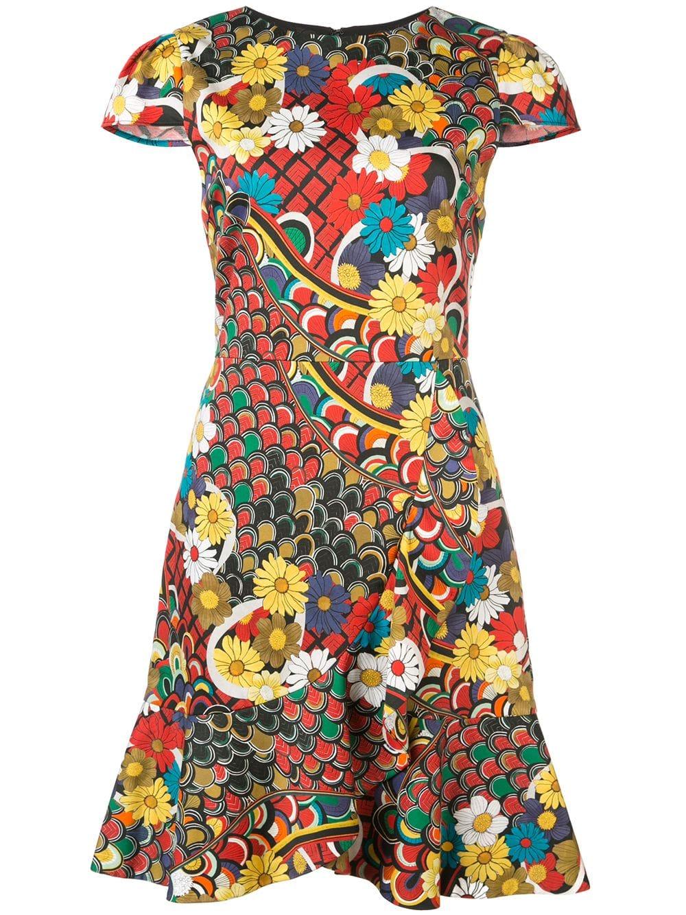 Kirby' Kleid mit Blumen-Print von Alice+Olivia. Merkmale: runder Ausschnitt, kurze Ärmel, Reißverschluss hinten, tailliert, Rüschen, ausgestellte Form und kurzer Schnitt. Farbe: mehrfarbig