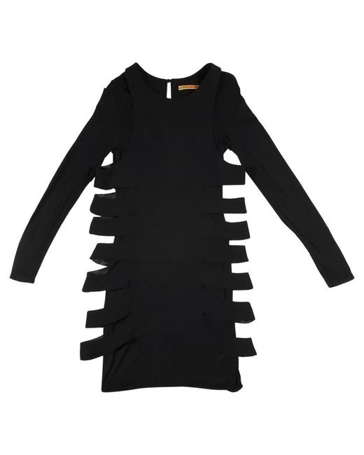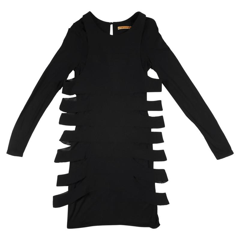 Alice & amp; Olivia schwarzes, schmeichelndes, zweilagiges, figurbetontes Kleid. Die innere Schicht besteht aus Polyester (97% Polyester, 3% Elasthan), während die äußere, ausgeschnittene Schicht aus Wolle besteht. Knopfverschluss hinten mit Schlüssellochöffnung. Länge 92 cm, Ärmel 62 cm, Brust 39 cm, Schultern 39 cm. Größe S (Größenkennzeichen ist abgeschnitten). Farbe: schwarz