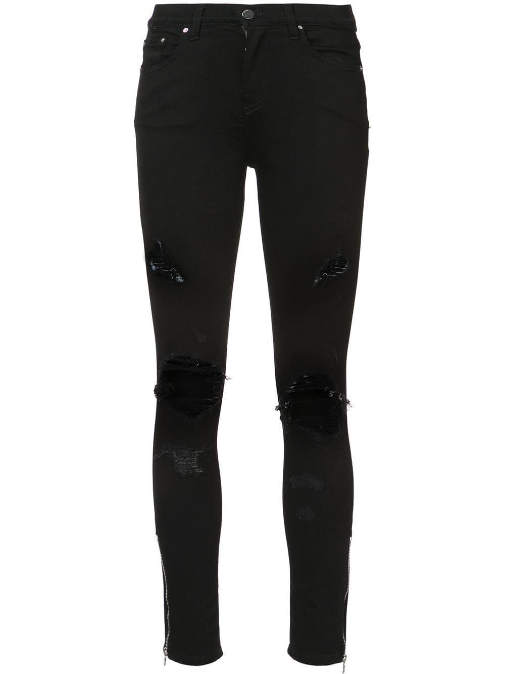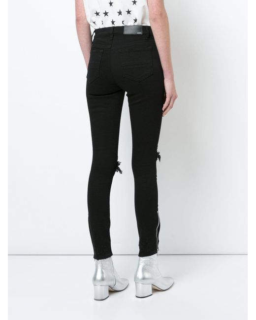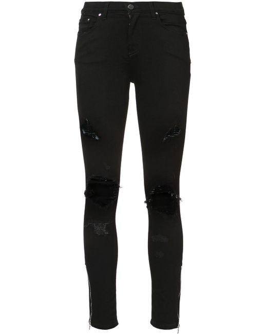 Schwarze 'Thrasher' Skinny-Jeans aus Baumwollstretch von Amiri mit folgenden Eigenschaften: Bund mit Gürtelschlaufen, mittlere Taillenhöhe, Reißverschluss mit Knopf, Five-Pocket-Design und Reißverschluss am Knöchel. Farbe: schwarz