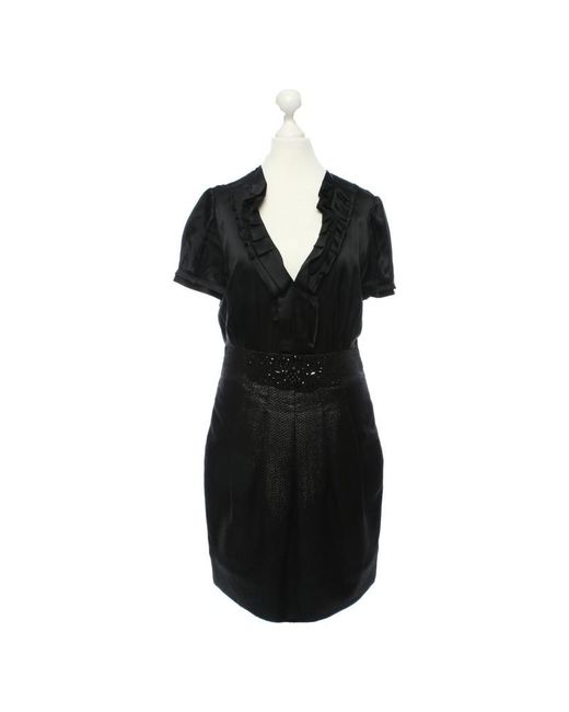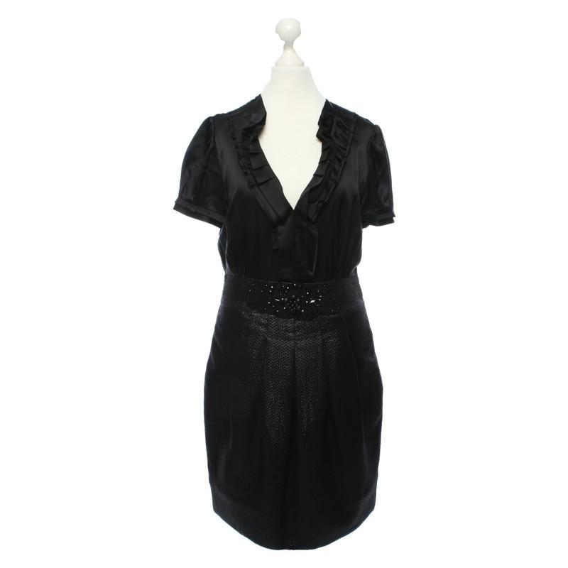 Merkmale / Details:. Obermaterial: 70% Polyester, 30% Viskose. Innenfutter: 100% Polyester. Seiden-Besatz. Schmuckperlen-Besatz. Rüschen, Brustbereich. V-Ausschnitt. Glänzende Oberfläche. Größe nach Maß Zustand:. Allgemein: Tragespuren, unauffällig. Allgemein: Verfärbung, unauffällig. Allgemein: Ziehfäden, unauffällig. Vorderseite: linker Brustbereich, Fleck, unauffällig. Vorderseite: Halsausschnitt, Fleck, unauffällig. Farbe: schwarz