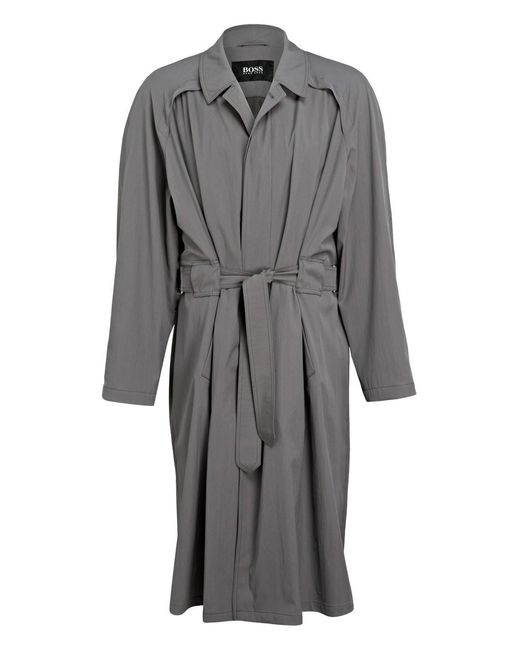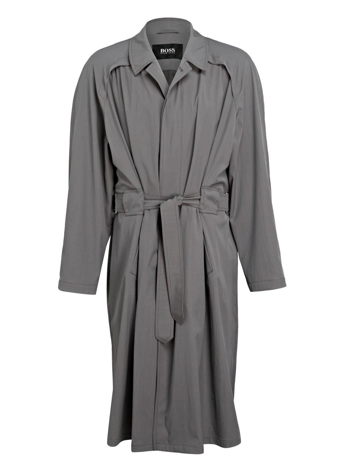 Der lässige Trenchcoat HOUSTON von BOSS ist ein ganz besonders modisches Modell für Ihr Repertoire. Das leichte Herrenmodell ist Teil der California Breeze-Kollektion, die erstmals auf dem Runway der New York Fashion Week vorgestellt wurde. Mit einer lockeren Silhouette designt, wird das Modell von einem abnehmbaren Gürtel und Raglanärmeln perfekt abgerundet, während die teilgefütterte Verarbeitung für einen angenehm leichten Tragekomfort sorgen kann. Lassen Sie sich dieses Must-have nicht entgehen! Details: Passform laut Hersteller: Relaxed Fit. Abfallender Reverskragen. Raglanärmel. Schließt mit verdeckter Knopfleiste. Abnehmbarer Taillengürtel mit D-Schließen. Leistentaschen. Innentaschen. Rmelabschluss mit Knopf und Riegel. Mittiger Gehschlitz. Elastischer Schurwoll-Mix. Teilgefütterte Verarbeitung an den Ärmeln. Maße bei Größe 50:- Rückenlänge ab Schulter: 122 cm- Schulterbreite: 52 cm- Ärmellänge: 71 cm- Taillenweite: 102 cm. Farbe: grau