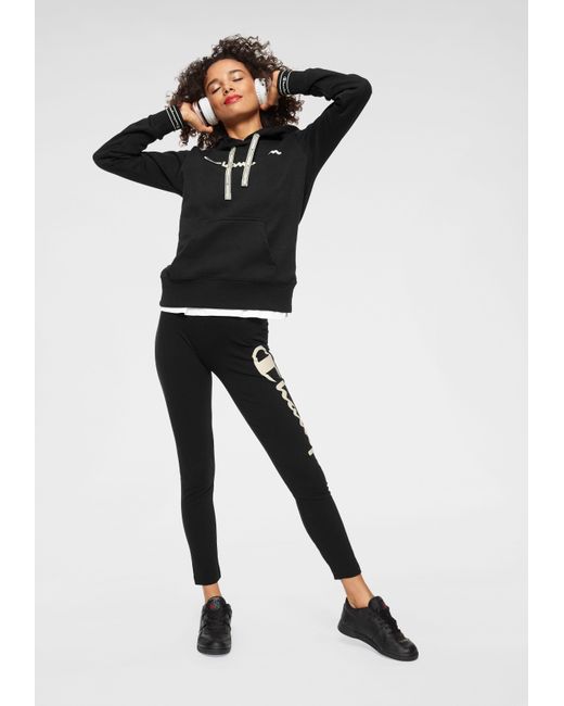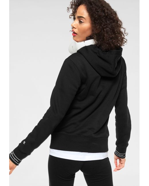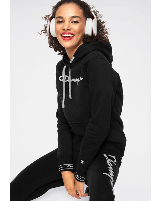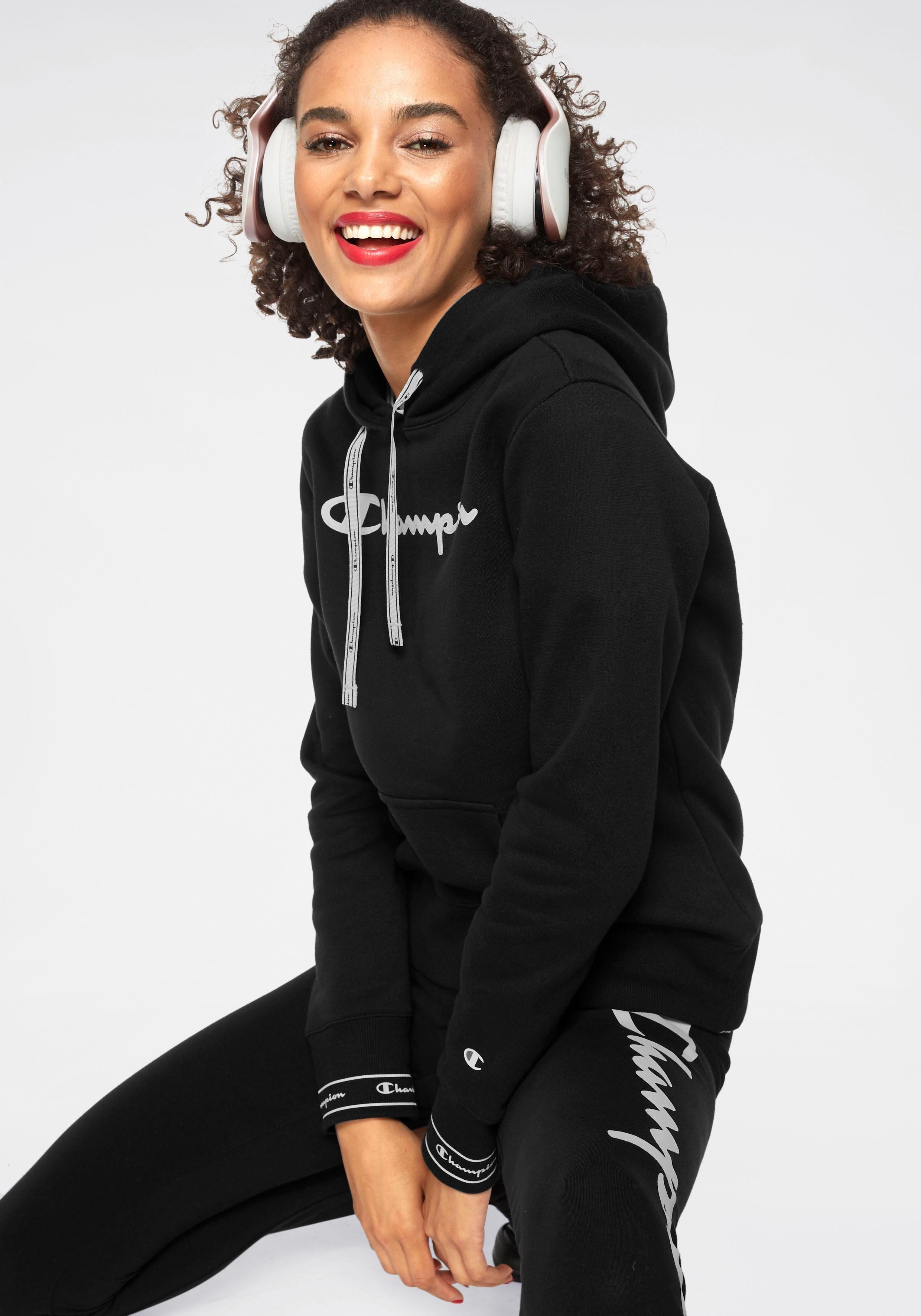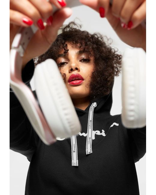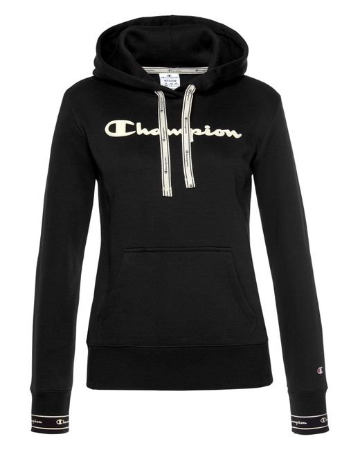 We like it casual: Das sportive Kapuzensweatshirt von Champion wird garantiert dein treuester Alltime-Favorite! Das Keypiece präsentiert sich im markentypischen Design, das durch den aufgedruckten Logoschriftzug auf der Brust unterstrichen wird. Die tonal gefütterte Kapuze mit breitem Kordelzug-Logoband, die Kängurutasche sowie die breiten Rippbündchen, an den Ärmel mit Logoschriftzügen prägen das Design des Hoodies und schenken dir einen coolen Look. Gleichzeitig versprechen dir die weiche Sweatqualität und die legere Silhouette einen ausgezeichneten Tragekomfort und lassen dich rundum wohlfühlen. Cool zu Sweatpants oder Tights. Tipp: Für einen angesagten Streetstyle trägst du dazu einen luftigen Midi-Rock! Mit dem Kapuzensweatshirt von Champion kreierst im Handumdrehen du sportive Trendlooks. Farbe: schwarz