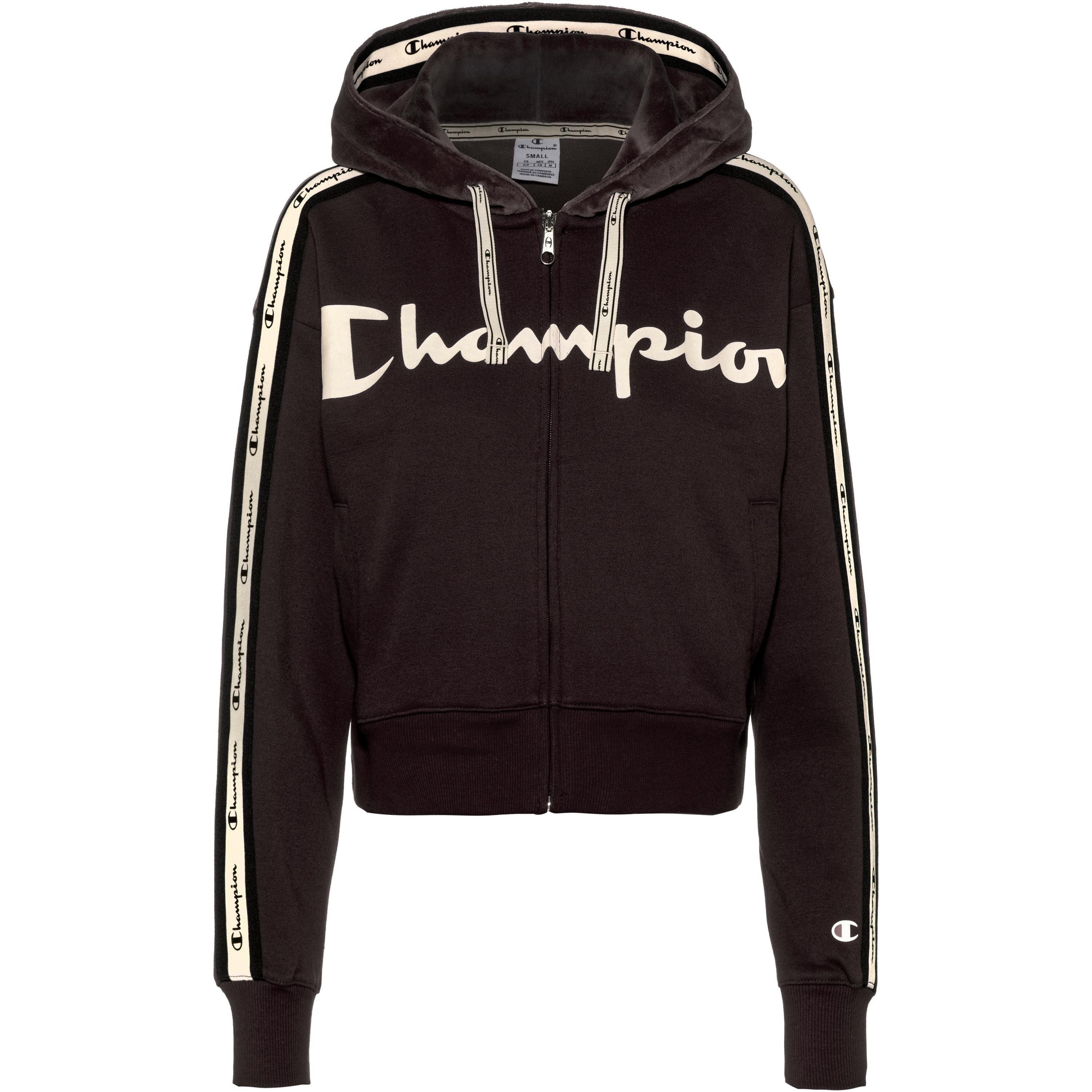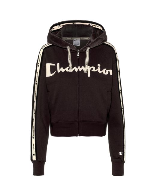 CHAMPION Bequeme Sweatjacke aus weichem Baumwoll-Mischgewebe; verstellbare Kapuze; seitliche Eingriffstaschen; kurze Passform; Markenschriftzug auf der Front; Material 79% Baumwolle, 21% Polyester. Farbe: schwarz