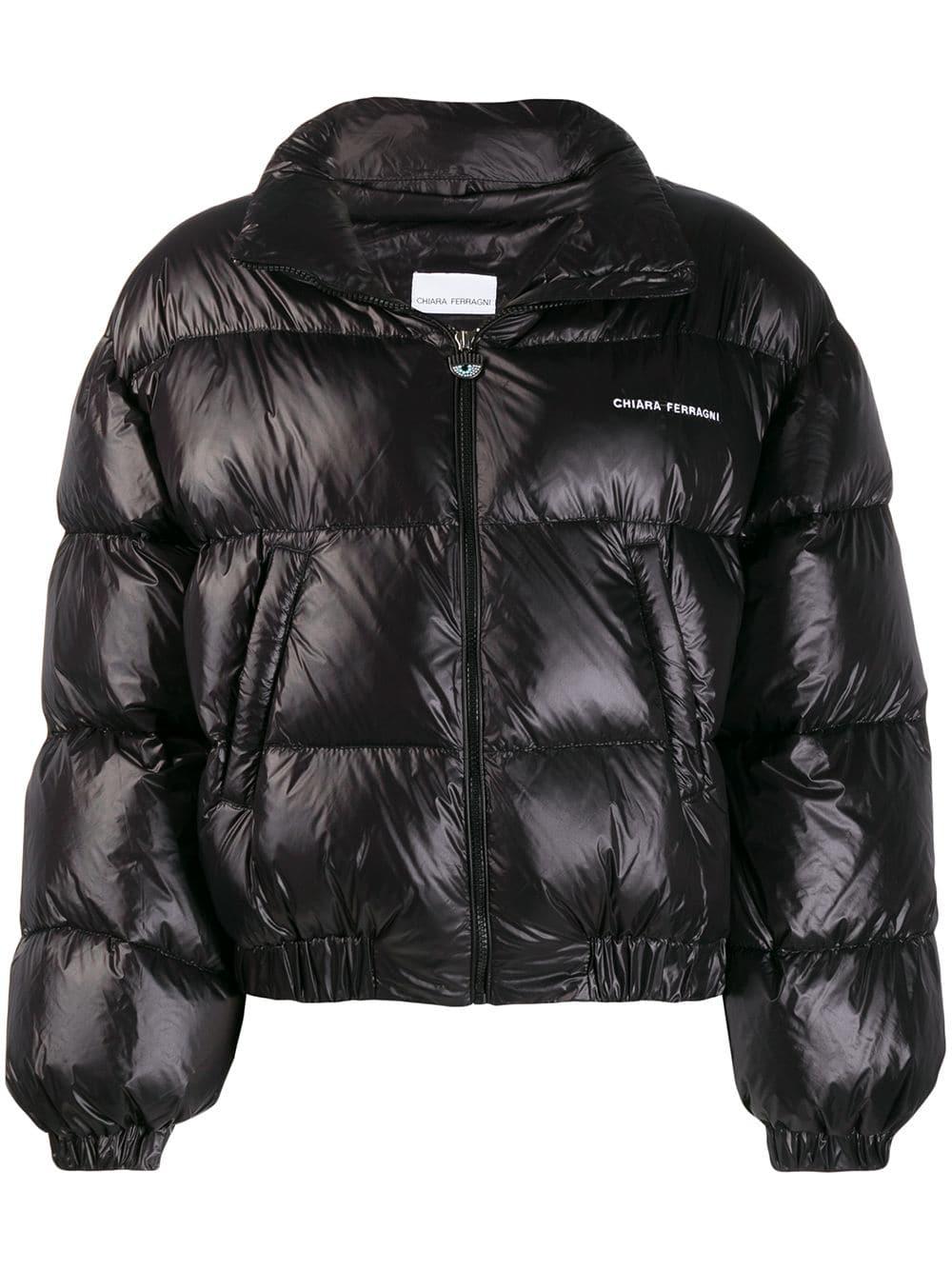 Gefütterte Jacke mit Reißverschluss aus Daunen von Chiara Ferragni. Merkmale: breiter Kragen, lange Ärmel, seitliche Taschen und elastische Bündchen.