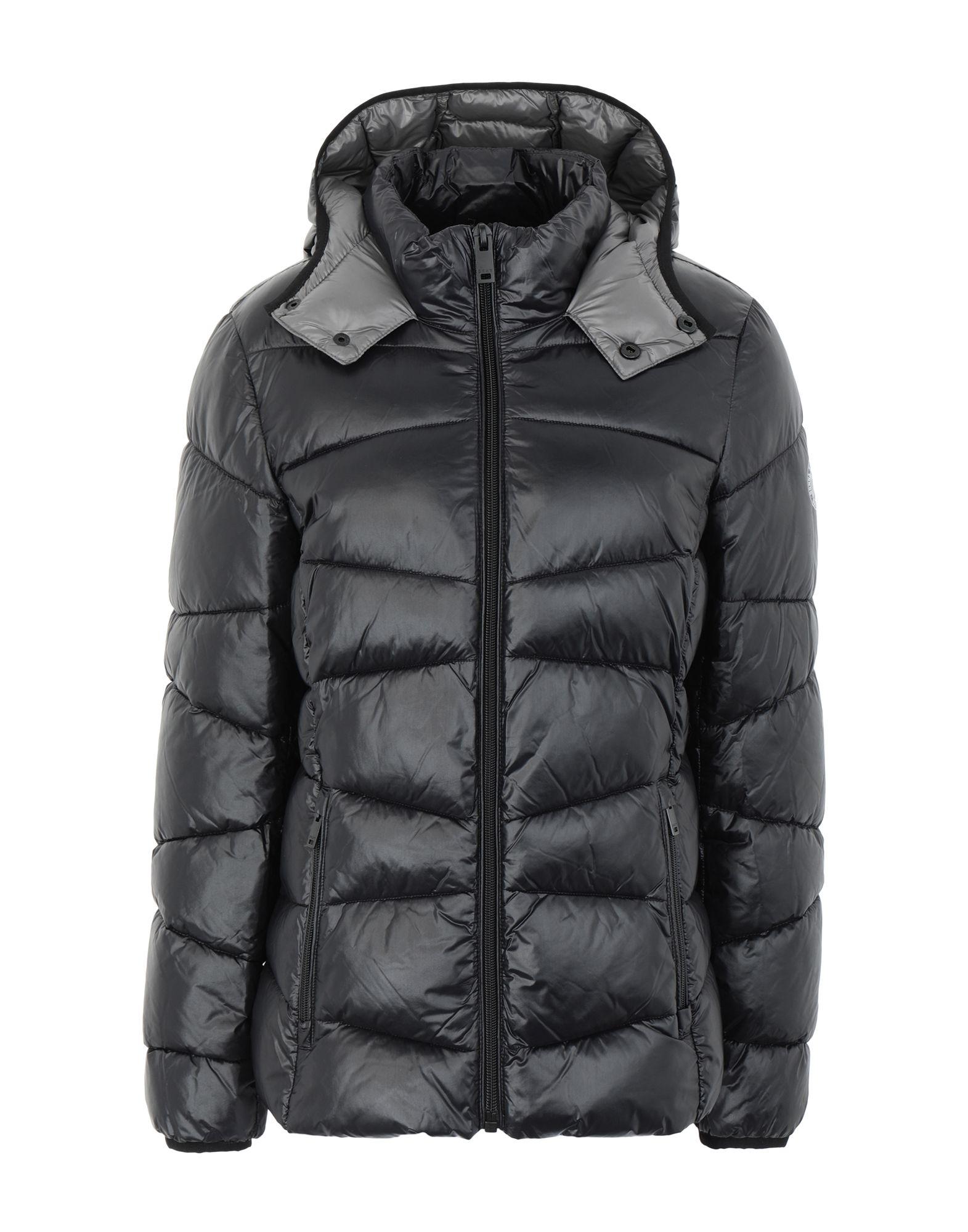 Logo, Kapuzenkragen, Einreiher, Hightech-Gewebe, Grund einfarbig, elastische Bündchen, viele Taschen, lange Ärmel, Druckknöpfe, Reißverschluss, innen gefüttert, einzelne Innentasche, weit geschnitten. 100% Polyamid. Farbe: schwarz