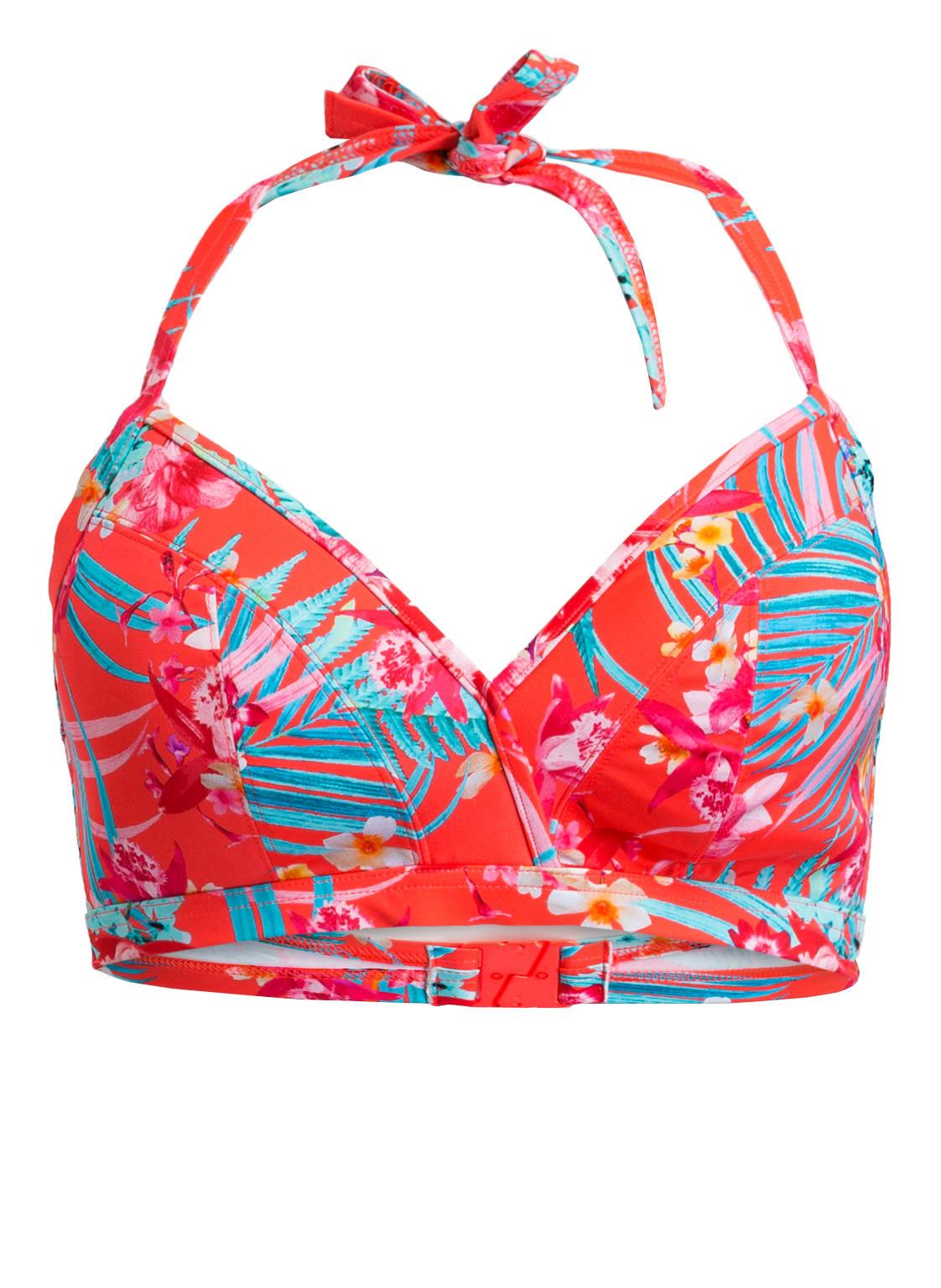 Let's go to the beach: Der Neckholder-Bikini-Top WILD SUN lädt dazu ein, die Sonne zu genießen. Ein farbenfreudiges Design mit floralem Muster begleitet Sie genauso wie die leicht wattierte Triangel-Form. Ein Essential für erfrischende Momente am Wasser! Details: Dezent wattierte Triangel-Cups. Mit seitlichen Formstäbchen. Clipverschluss. Floraler Print. Farbe: rot