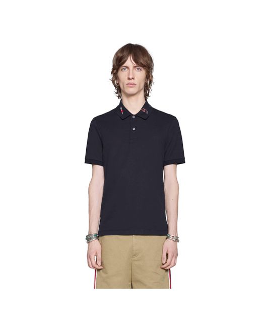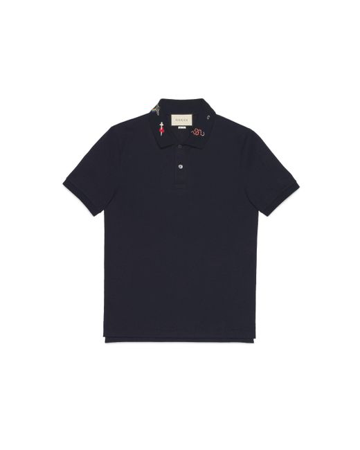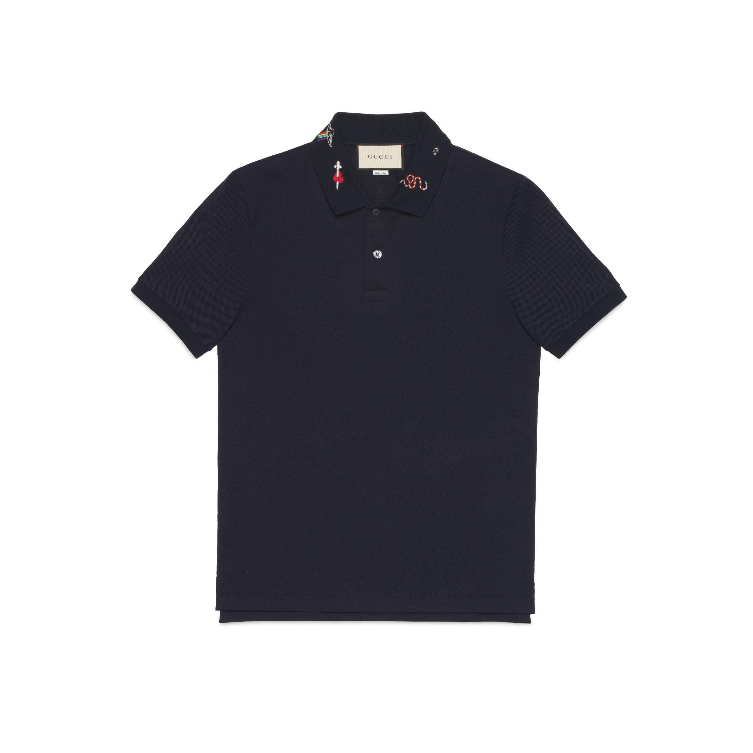 Ein poloshirt aus stretch-baumwolle mit stickereien entlang des kragens, die verschiedene für das haus synonym stehende symbole aufweisen. Der auf die ivy-league-schulen im nordosten der vereinigten staaten zurückgehende preppy-stil prägt nach wie vor das gucci narrativ. Für pre-fall 2018 geht das konzept über den ursprünglichen lifestyle hinaus und wird nun von den codes und androgynen silhouetten des hauses gekennzeichnet. Blauer stretch-baumwoll-piqué mit gucci symbol-stickerei am kragen. 93 % baumwolle und 7 % elastan. Hergestellt in italien. Das model ist 188cm groß und trägt größe medium. RTW.
