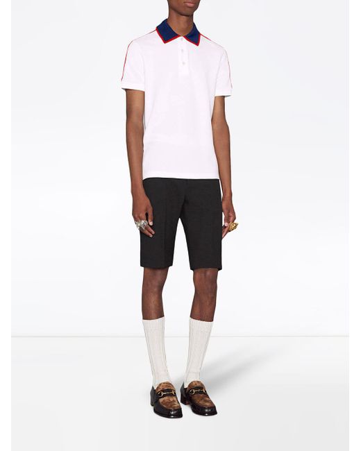 Ein poloshirt aus baumwolle mit einem kontrastierenden kragen und besatz. Der gucci streifen spiegelt den sportlichen einfluss der kollektion wider und mixt sportbekleidungselemente mit preppy-silhouetten. Weißer stretch-baumwoll-piqué. Blauer kragen mit rotem besatz. Gucci jacquard-streifen entlang der ärmel. Durchgehende knopfleiste mit knöpfen aus perlmutt. 93 % baumwolle und 7 % elastan. Hergestellt in italien. Das model ist 188cm groß und trägt größe medium. RTW.