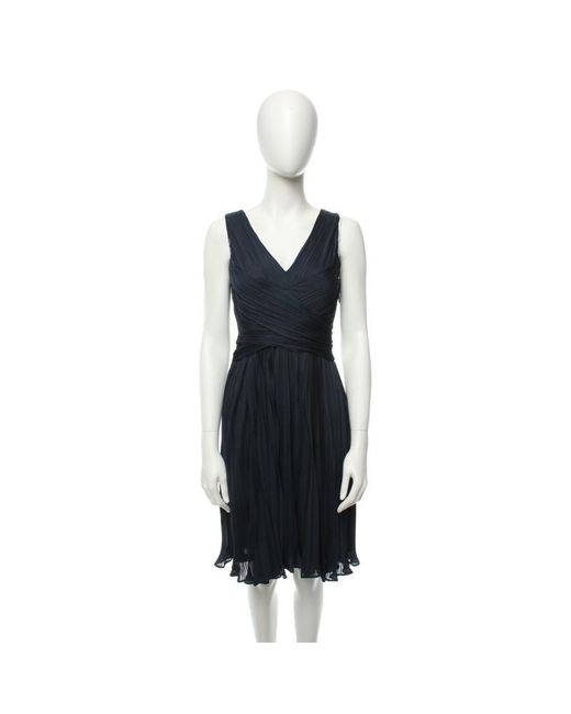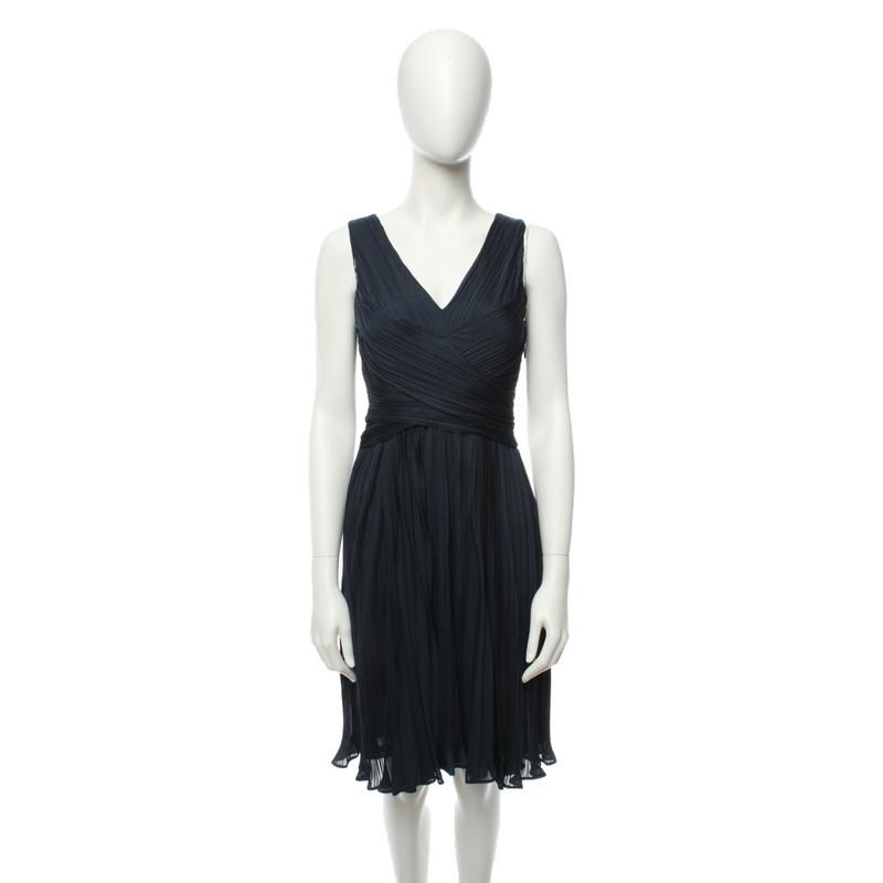Merkmale / Details:. Materialetikett fehlt. Gefüttert. Plisseefalten. Drapierung, Vorderseite. Taillierter Schnitt. Nahtverdeckter Reißverschluss, Seite. Größenangabe nach Maß Zustand:. Allgemein: Tragespuren, unauffällig. Allgemein: Ziehfäden, unauffällig. Innen: Größenangabe fehlt, unauffällig. Innen: Wäscheschild fehlt, unauffällig. Farbe: blau