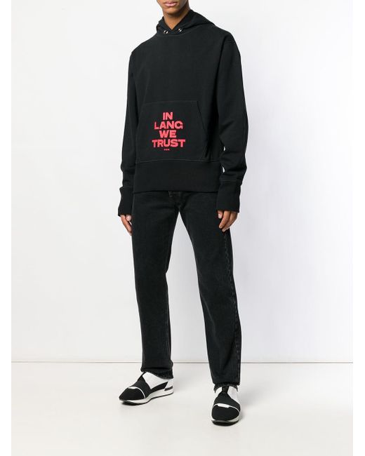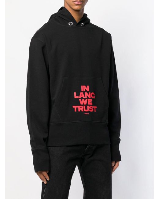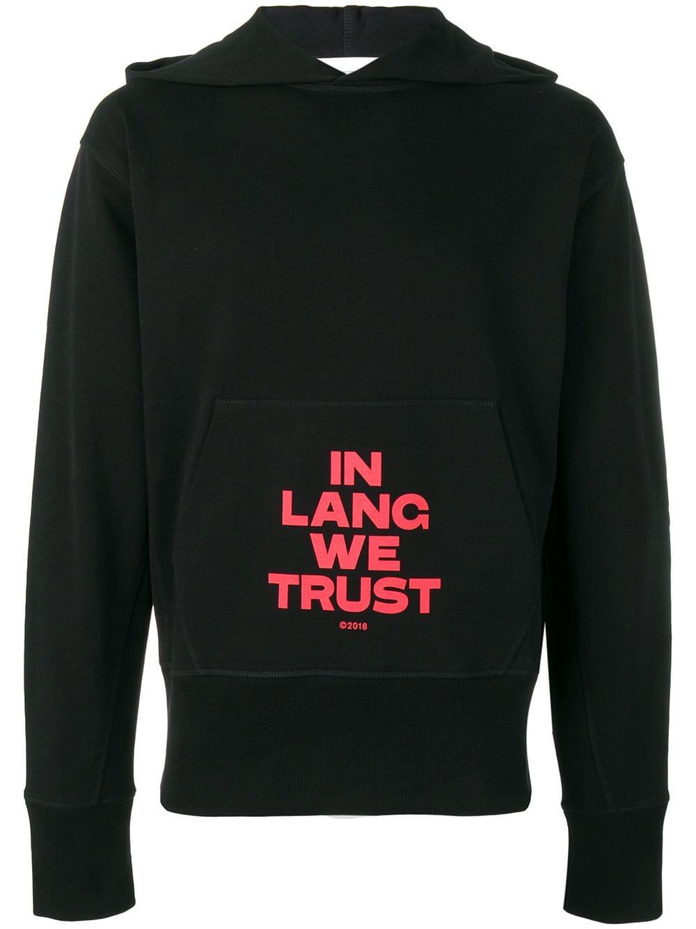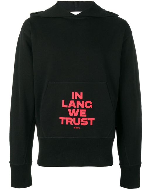 In Lang We Trust' Kapuzenpullover aus Baumwolle von Helmut Lang mit folgenden Eigenschaften: Kapuze, lange Ärmel, Kängurutasche und gerippte Abschlüsse. Farbe: schwarz