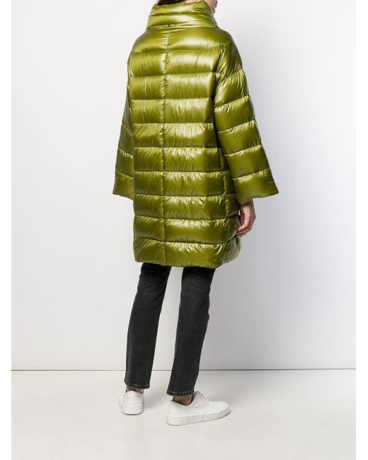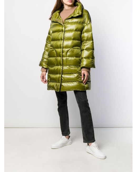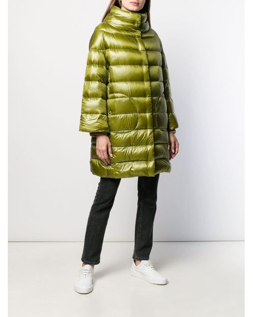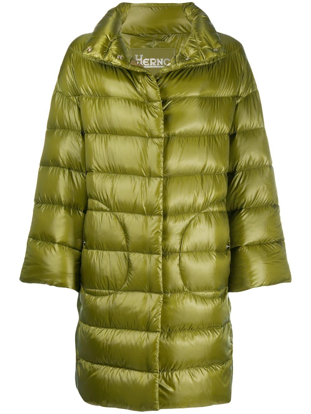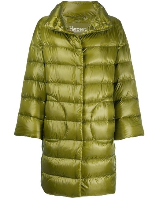 Daunenmantel mit Stehkragen aus Baumwollgemisch von Herno. Merkmale: Stehkragen, Druckknopfverschluss, lange Ärmel, seitliche Taschen, gerader Schnitt und knielang. Farbe: grün