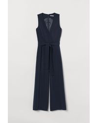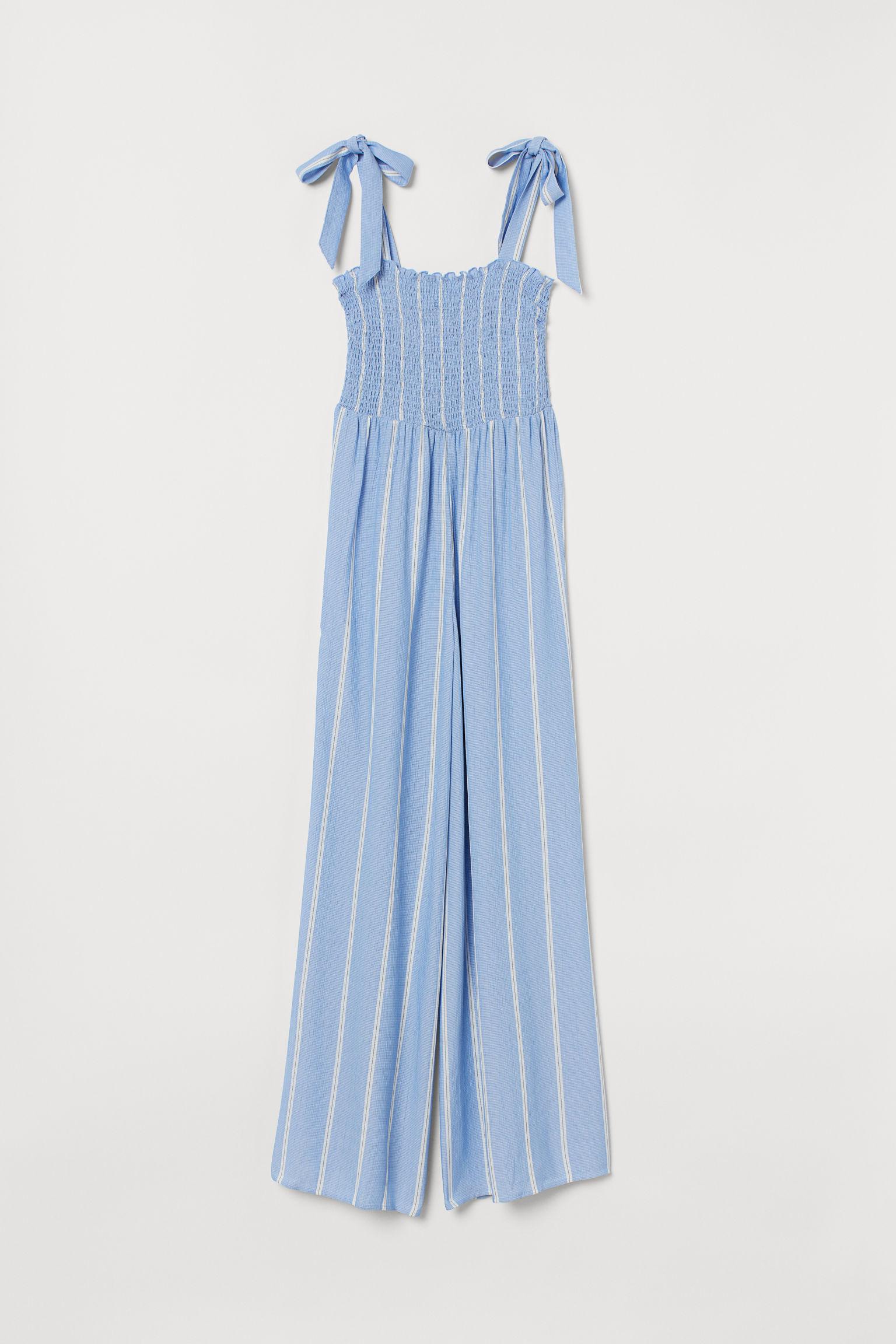 Jumpsuit aus gecrinkeltem Viskosestoff mit gesmoktem Oberteil. Mit breiten, oben gebundenen Trägern, einer hohen Taille und geraden, weiten Beinen. Ungefüttert. Farbe: blau