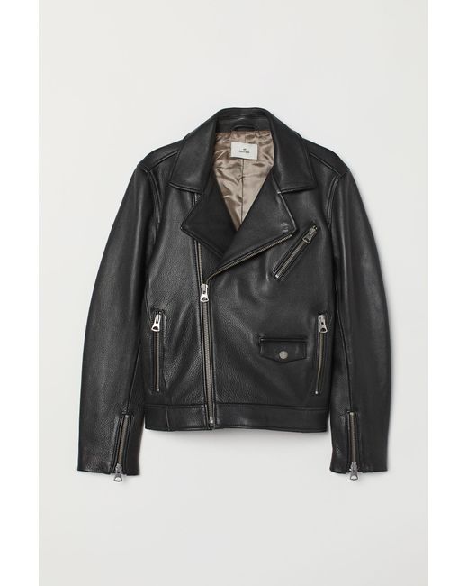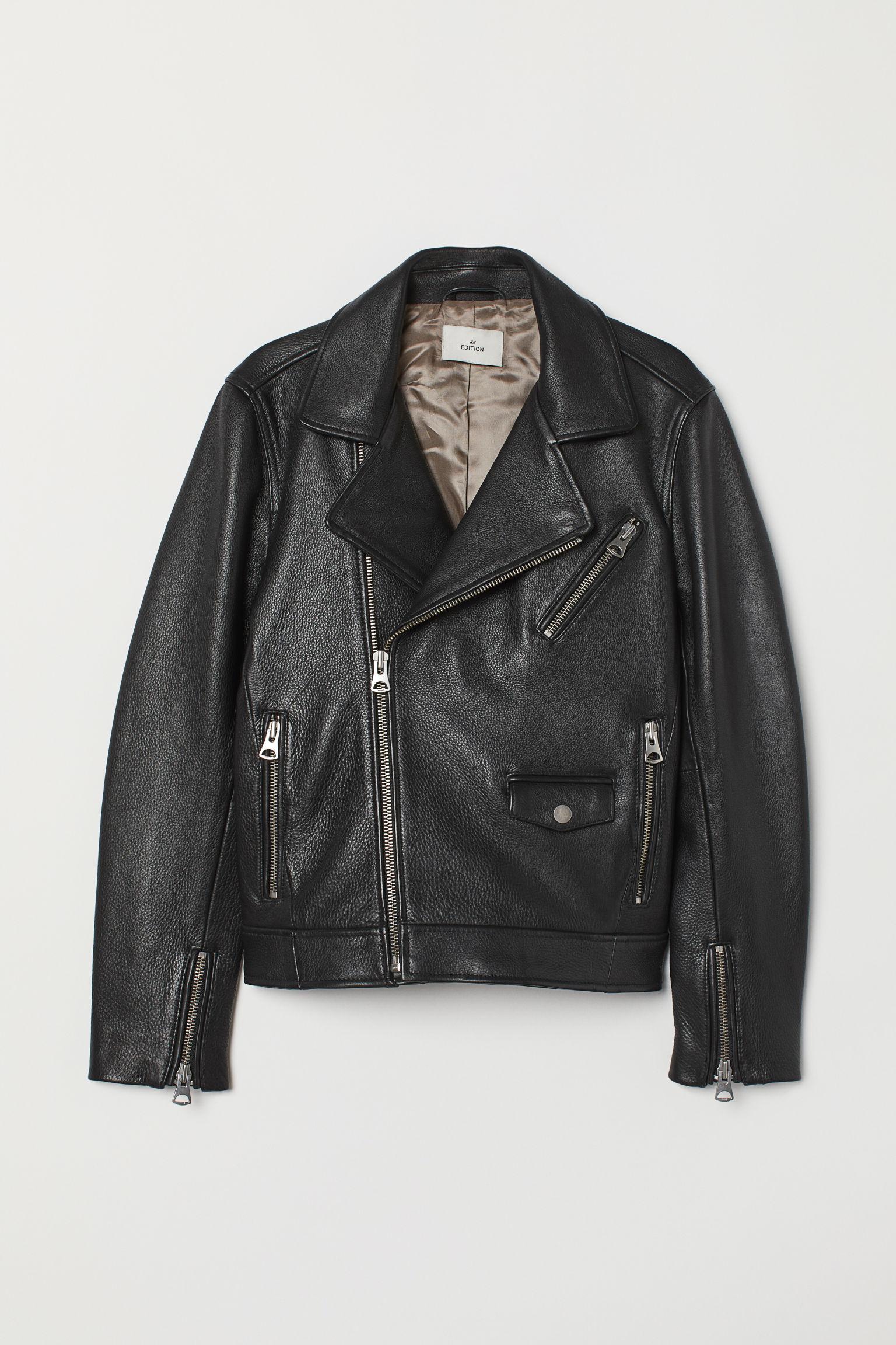 Bikerjacke aus Leder mit Kragen und Revers mit verdeckten Druckknöpfen. Vorn ein schräger Reißverschluss. Brusttasche und Seitentaschen mit Zipper sowie eine kleine Pattentasche mit Druckknopf. Zipper an den Ärmelabschlüssen. Eine Innentasche. Futter aus Viskose. Farbe: schwarz