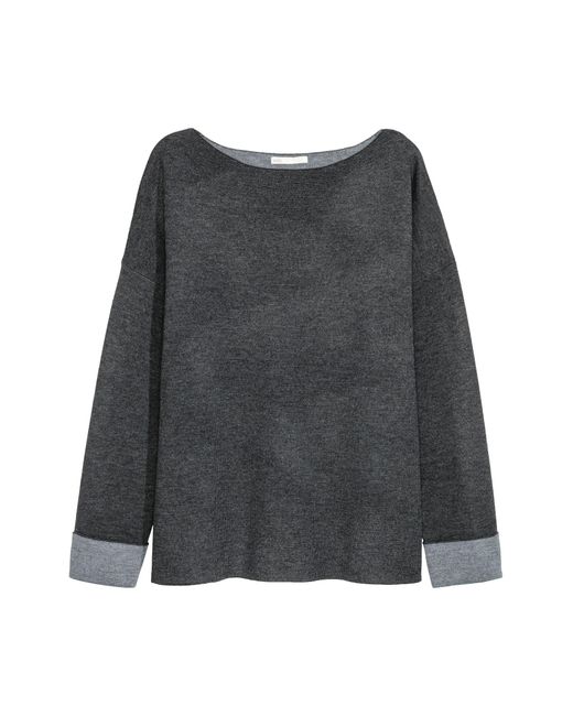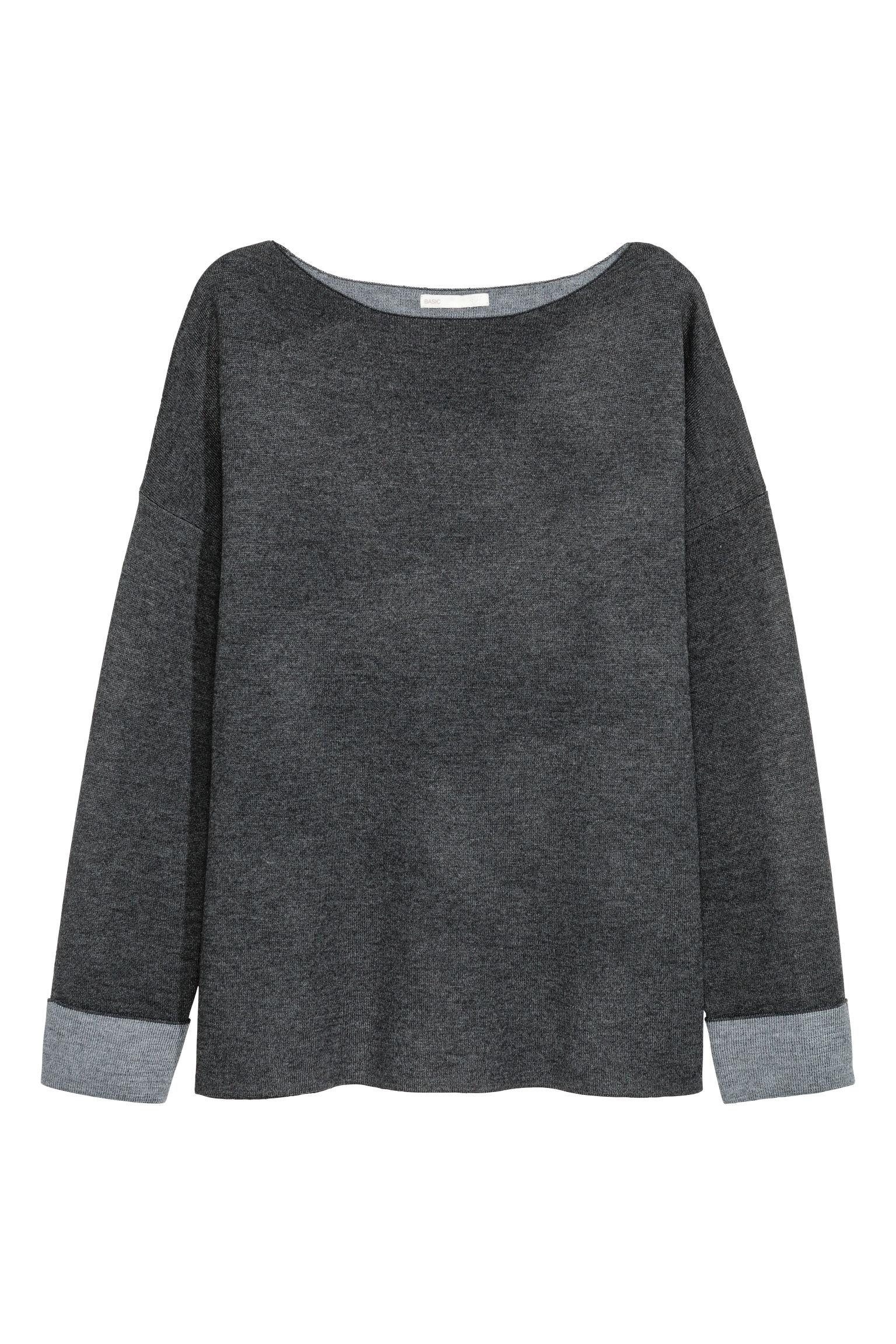 Doppelt gestrickter Pullover aus weichen Strick mit Wollanteil. Der Pullover hat überschnittene Schultern und lange Ärmel mit fixiertem Umschlag. Farbe: grau