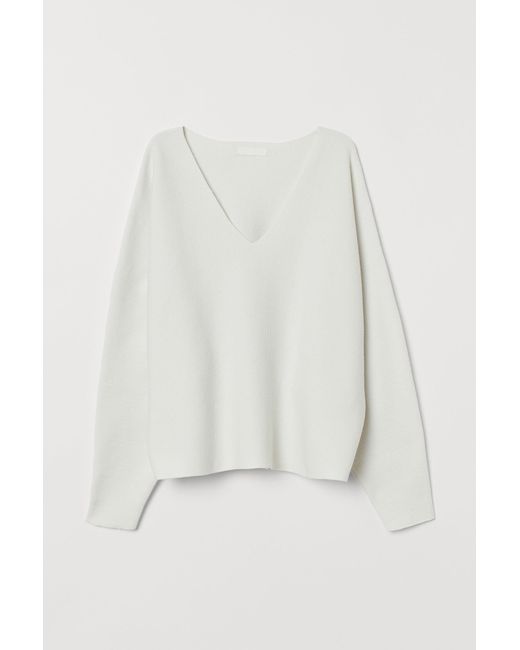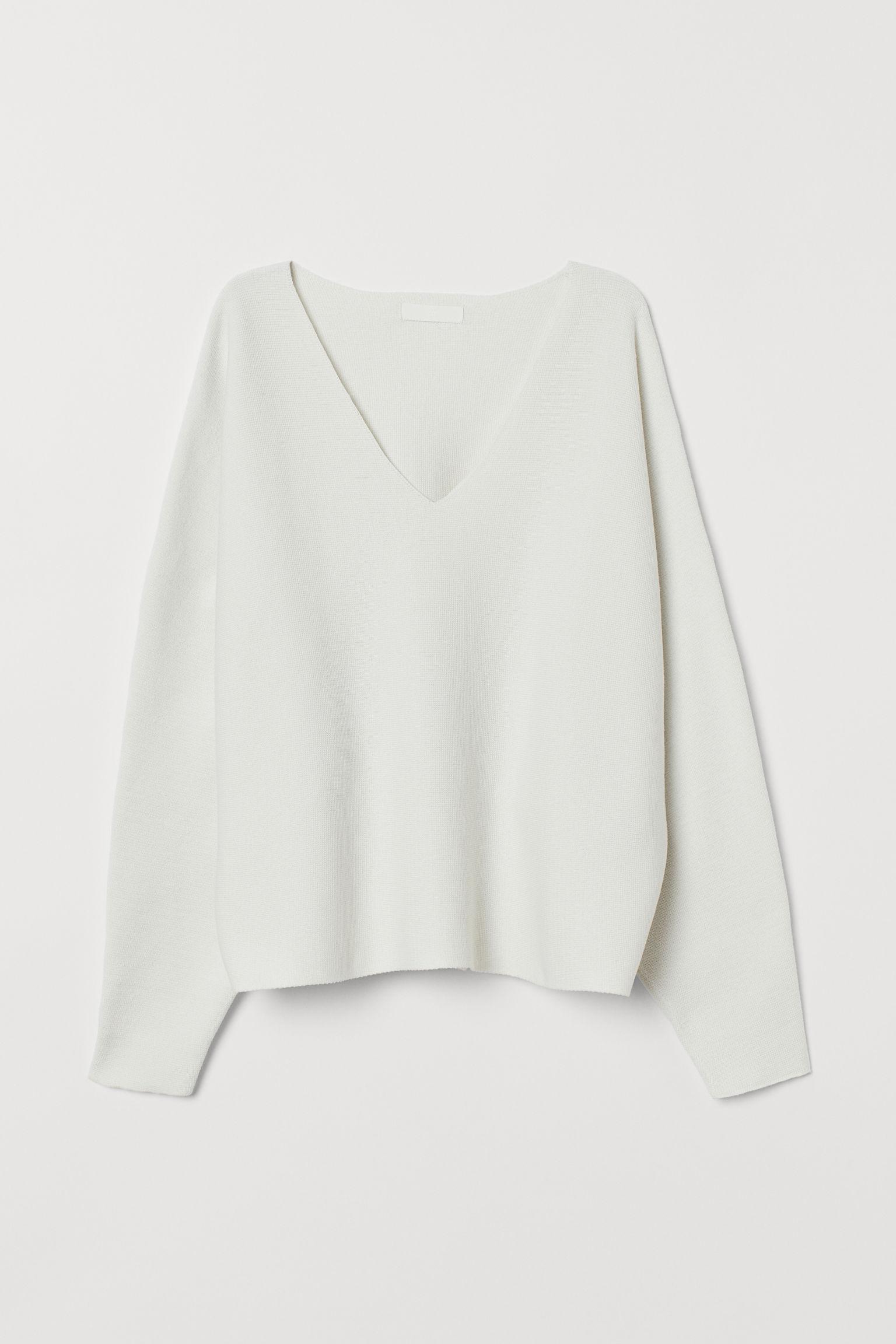 CONSCIOUS. Weiter Pullover aus weichem Strick mit Wollanteil. Mit V-Ausschnitt und langen Dolmanärmeln. Der Polyester ist recycelt. Farbe: weiß
