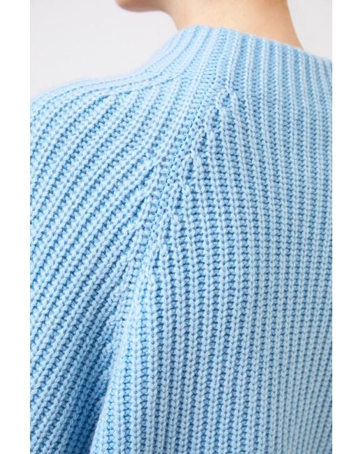 Pullover in Hellblau. Turtle-Neck. Patentrippstrick. Verkürzte Ärmel. Gerade Silhouette. Auf Hüfthöhe endend. Größe des Models: 180 cm. Material: 100% Cashmere. Farbe: blau