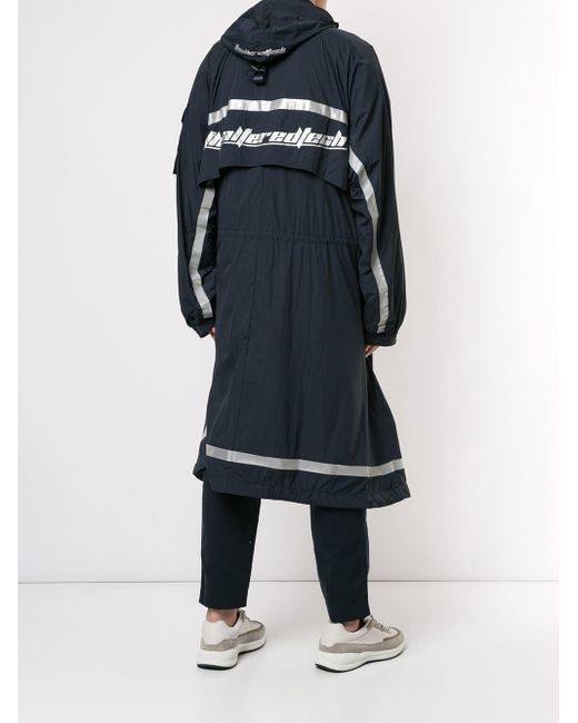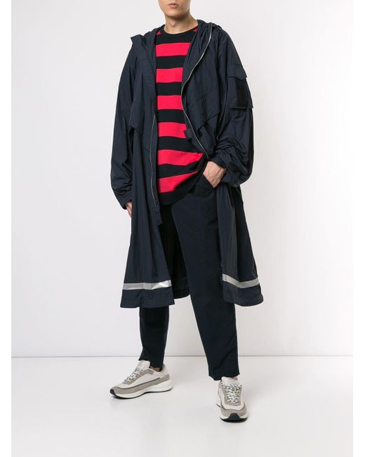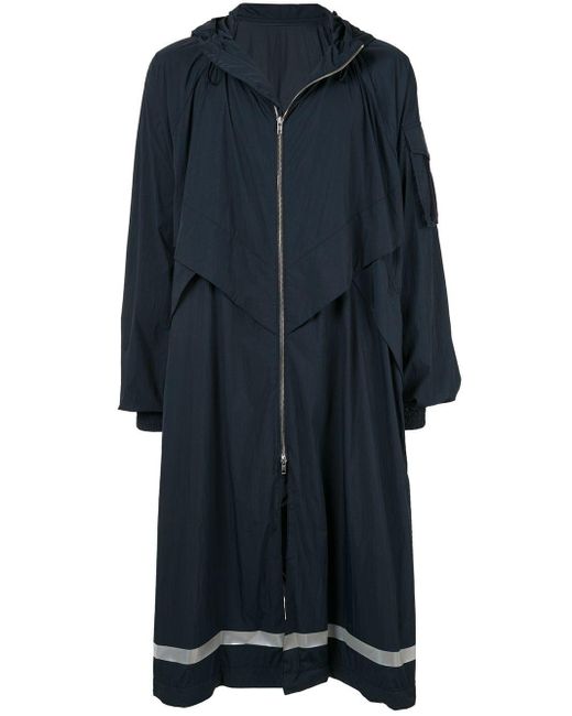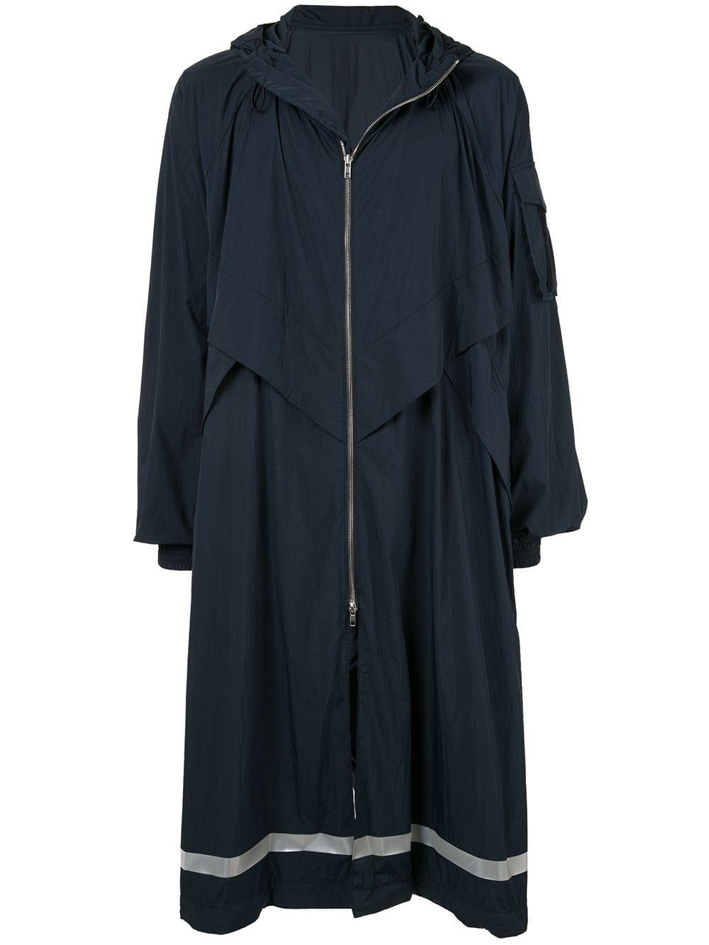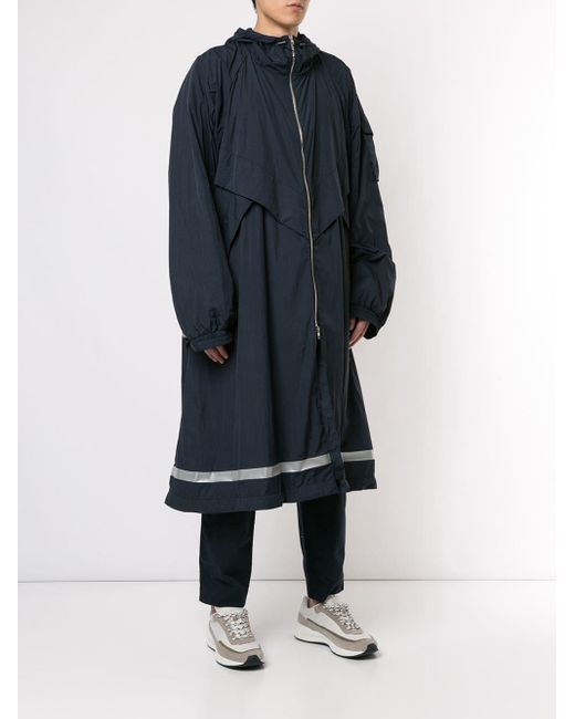 Oversized-Regenmantel mit Kapuze von Juun. J. Merkmale: Kapuze mit Kordelzug, Reißverschluss an der Vorderseite, lange Ärmel, reflektierende Elemente, elastische Bündchen und bis zur Mitte der Wade. Farbe: blau