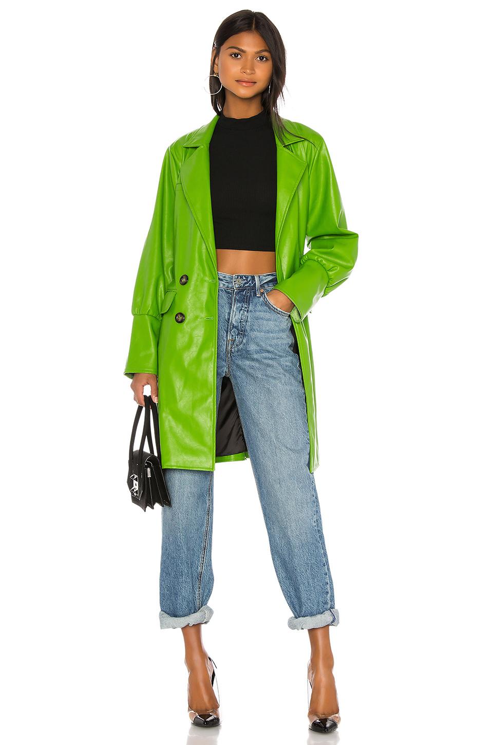 KENDALL + KYLIE Farrah Vegan Leather Trench Coat in Green. 55% Polyester, 45% Polyurethan. Chemische Reinigung. Knopfverschluss vorn. Pattentaschen an der Seite. Abnehmbarer Bindegürtel in der Taille. Lederimitat. Importiert. Farbe: grün