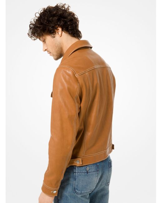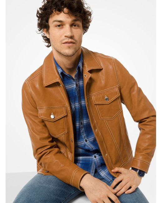 Diese Jacke aus weichem poliertem Leder ist so lässig wie eine Jeansjacke, wirkt aber mit ihren kontrastierenden Nähten gleich viel eleganter. Abgerundet wird das Design durch zwei Taschen an der Vorderseite und polierte Knöpfe. Am besten kommt sie in Kombination mit dunklen Farbtönen zur Geltung. 100 % Leder. Knopfverschluss. Chemische Reinigung (professionelle Lederreinigung). Importiert. Model ist 1,85 m groß und trägt Größe M. Farbe: braun