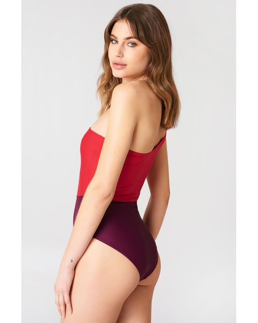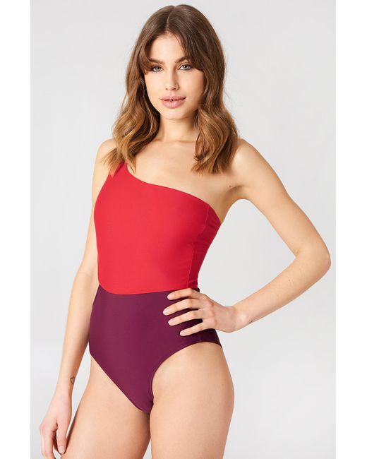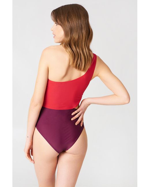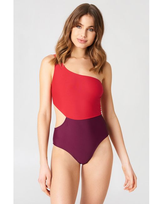 Der One Shoulder Block Swimsuit von NA-KD Swimwear hat Kontrastfarben, ein Cutout an der Seite, ist hoch geschnitten an den Beinen, hat minimale Bedeckung im Rücken und nur einen Träger und eine freie Schulter. Farbe: rot