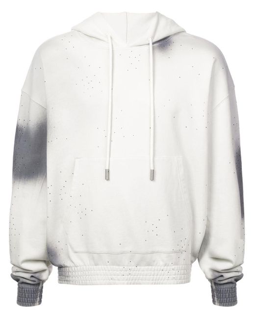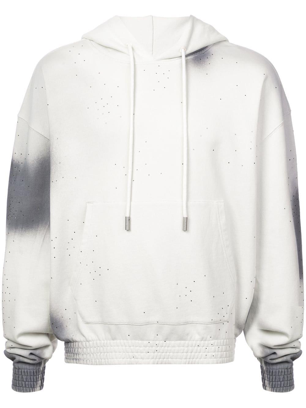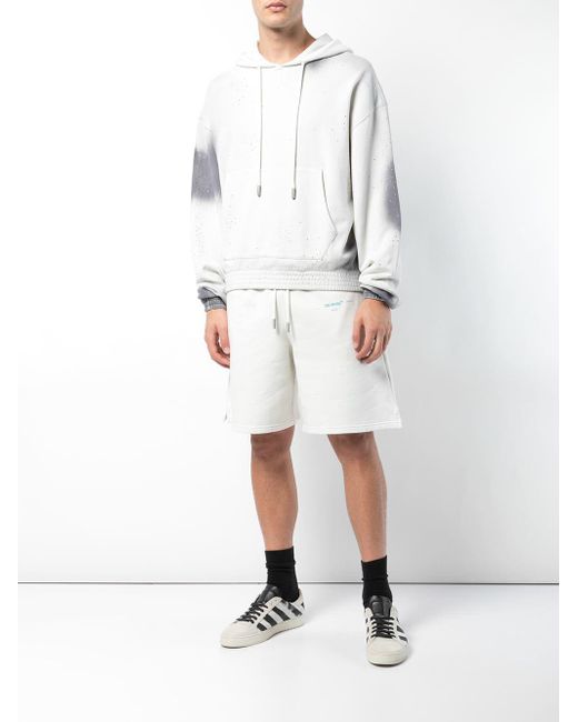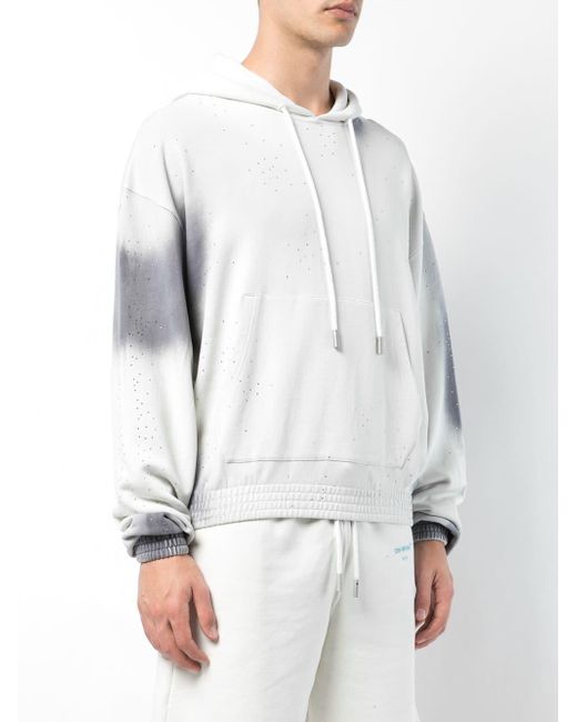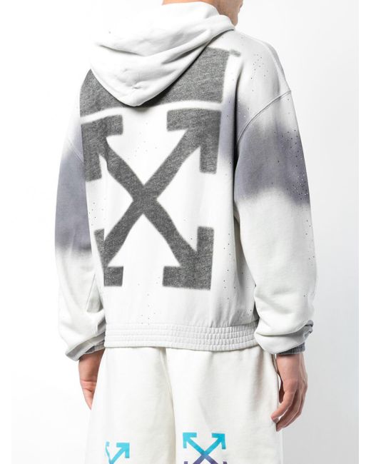 Kapuzenpullover mit Farbverlauf aus Baumwolle von Off-White mit folgenden Eigenschaften: Kapuze mit Kordelzug, lange Ärmel, gerippte Bündchen/gerippter Saum, Batikmuster und aufgedrucktes Logo hinten. Farbe: grau