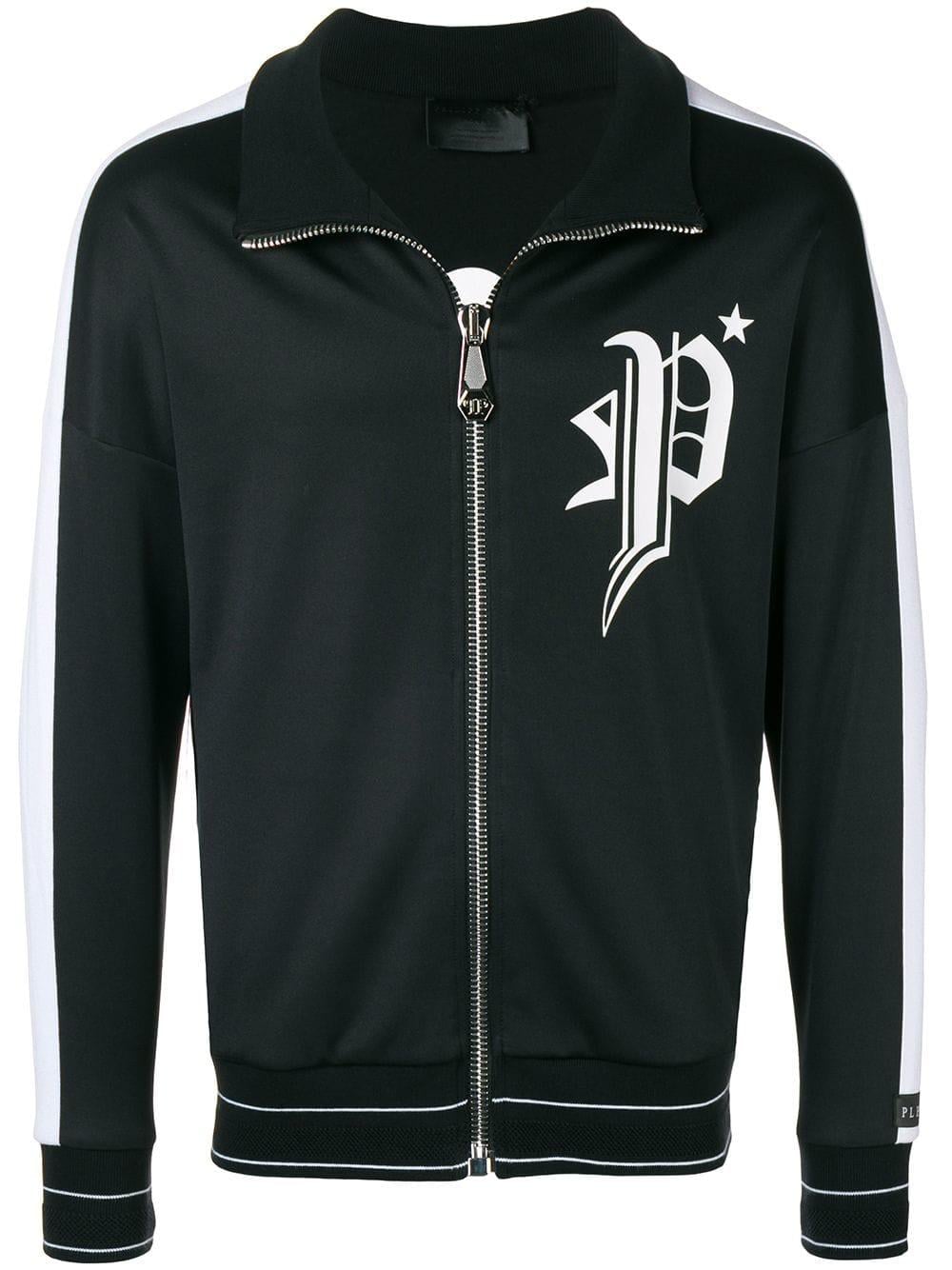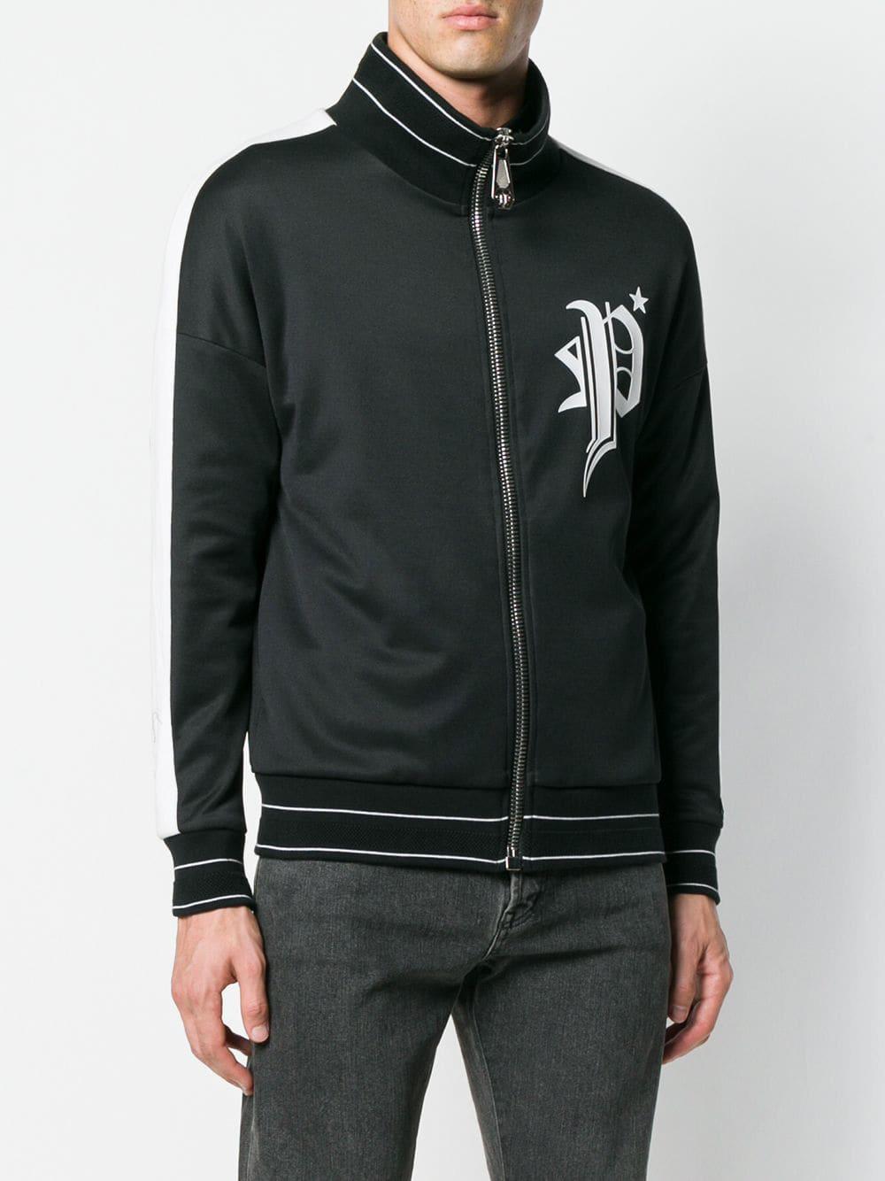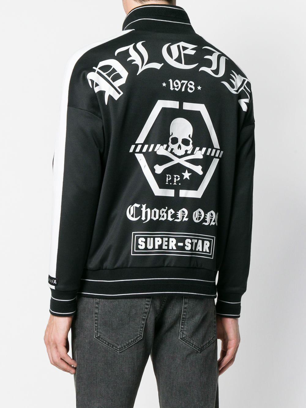 Weiter zu FarfetchSchwarze Jacke mit Print aus Baumwolle und Baumwollgemisch von Philipp Plein mit folgenden Eigenschaften: weiter Stehkragen, Reißverschluss an der Vorderseite, tief angesetzte Schulter, lange Ärmel, Logo an der Brust, aufgedrucktes Logo hinten und Streifen. Farbe: schwarz