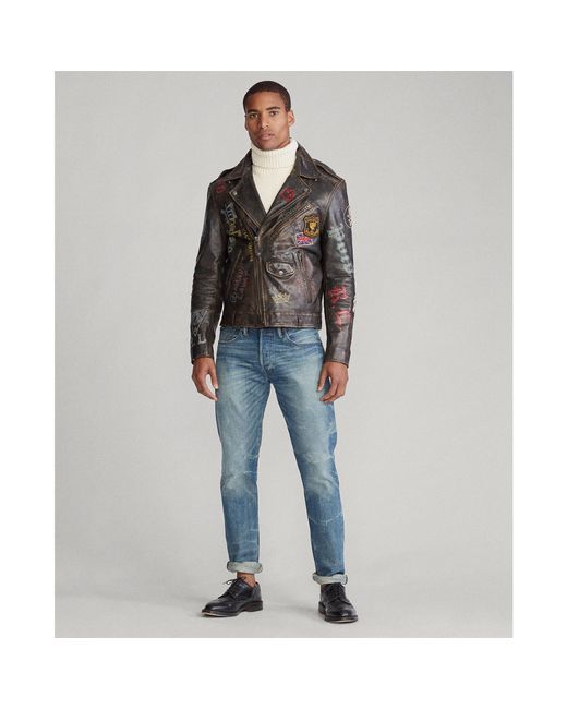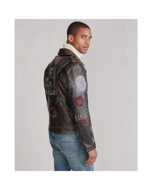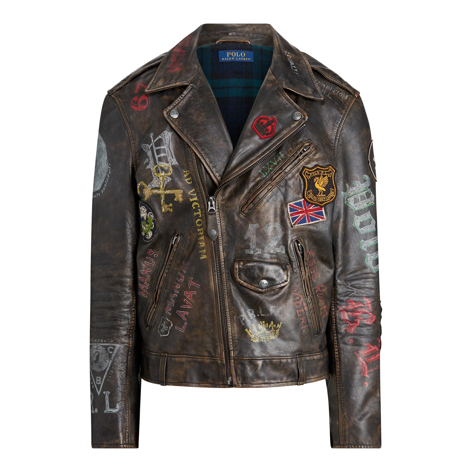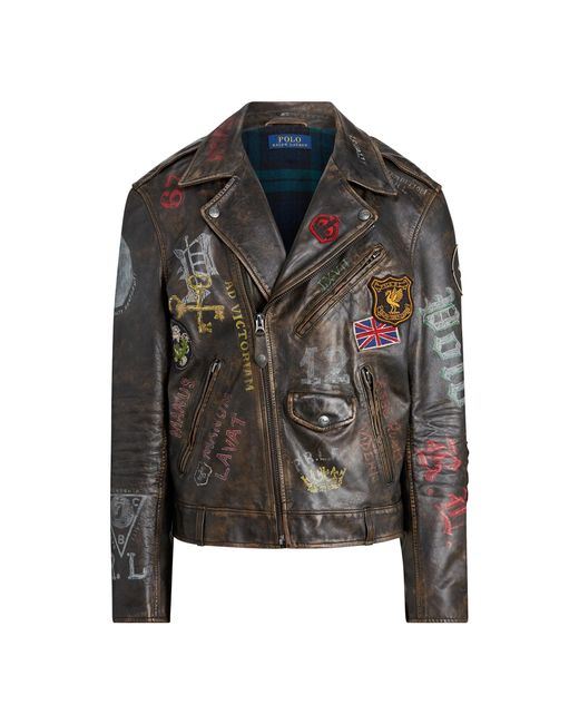 Die legendäre Bikerjacke mit Vintage-Flair. Das Leder in Used-Optik mit einem Mix aus Wappenaufnähern und handgemalten Bikermotiven aus den 1920er- und 1930er-Jahren erinnert an die britische Rebellenkultur. Farbe: mehrfarbig