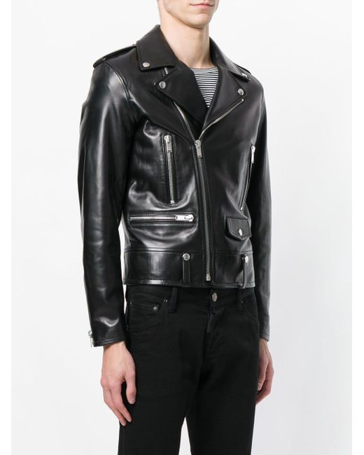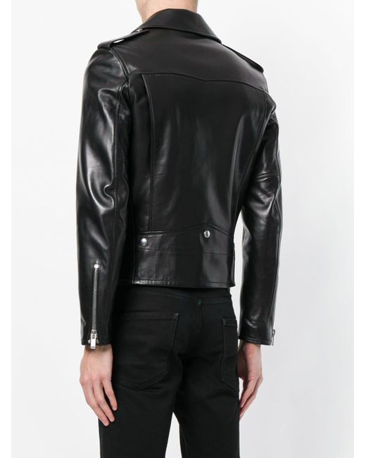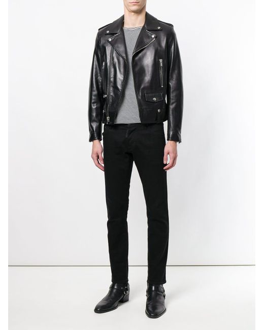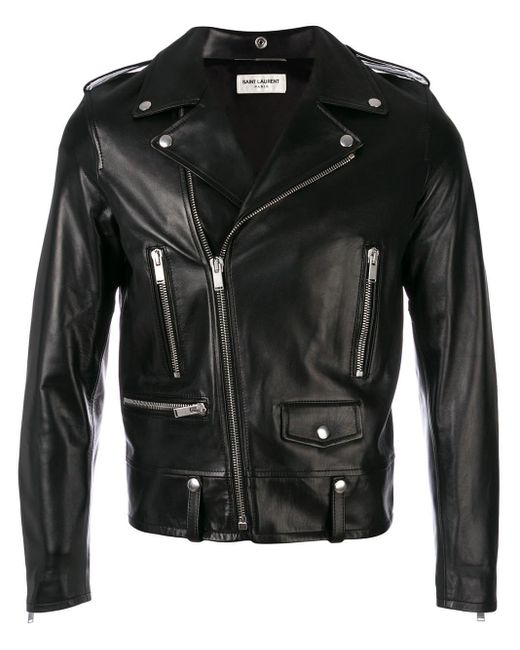 Schwarze Bikerjacke aus Lammleder und Baumwollgemisch von Saint Laurent mit folgenden Eigenschaften: klassisches Revers, nicht mittiger Reißverschluss vorne, lange Ärmel, Bündchen mit Reißverschluss, Schulterpolster, Vordertaschen mit Reißverschluss, Vordertasche mit Klappe, Gürtelschlaufen und Schulterklappen.