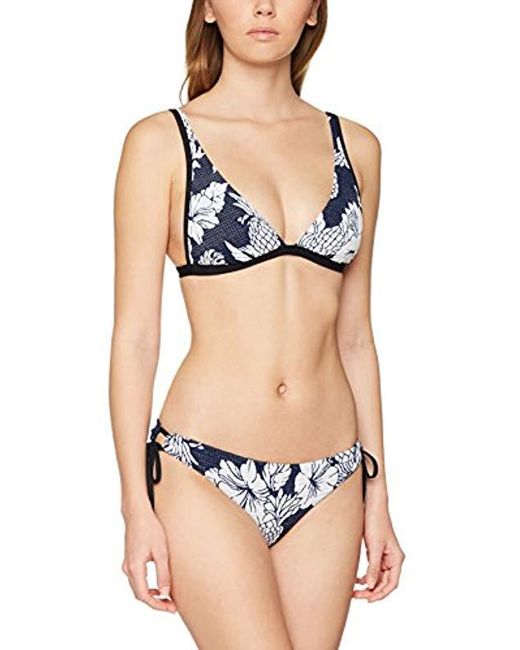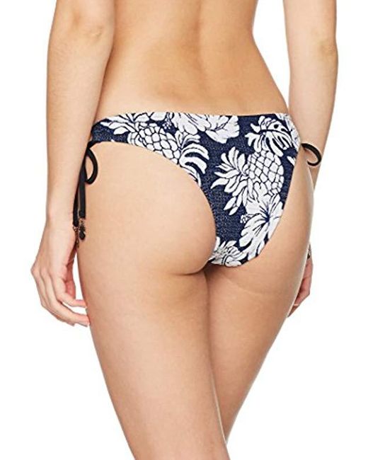 Seafolly ROYAL HORIZON. Bikini-Hose mit sehr hohem Beinausschnitt und niedrigem Bund; gekrepptes Webmuster; seitliche Schnürung mit Ananas-Applikationen; gefüttert; Material 85% Polyester, 15% Elastan, Futter 88% Polyamid, 12% Elastan. Royal Horizon zeigt einen tiefblauen Fond, über den sich Ananas und Hibiskusblüten ergießen. Royal Horizon Brazilian Loop Tie Side in der Farbe Royal Horizon. Farbe: blau