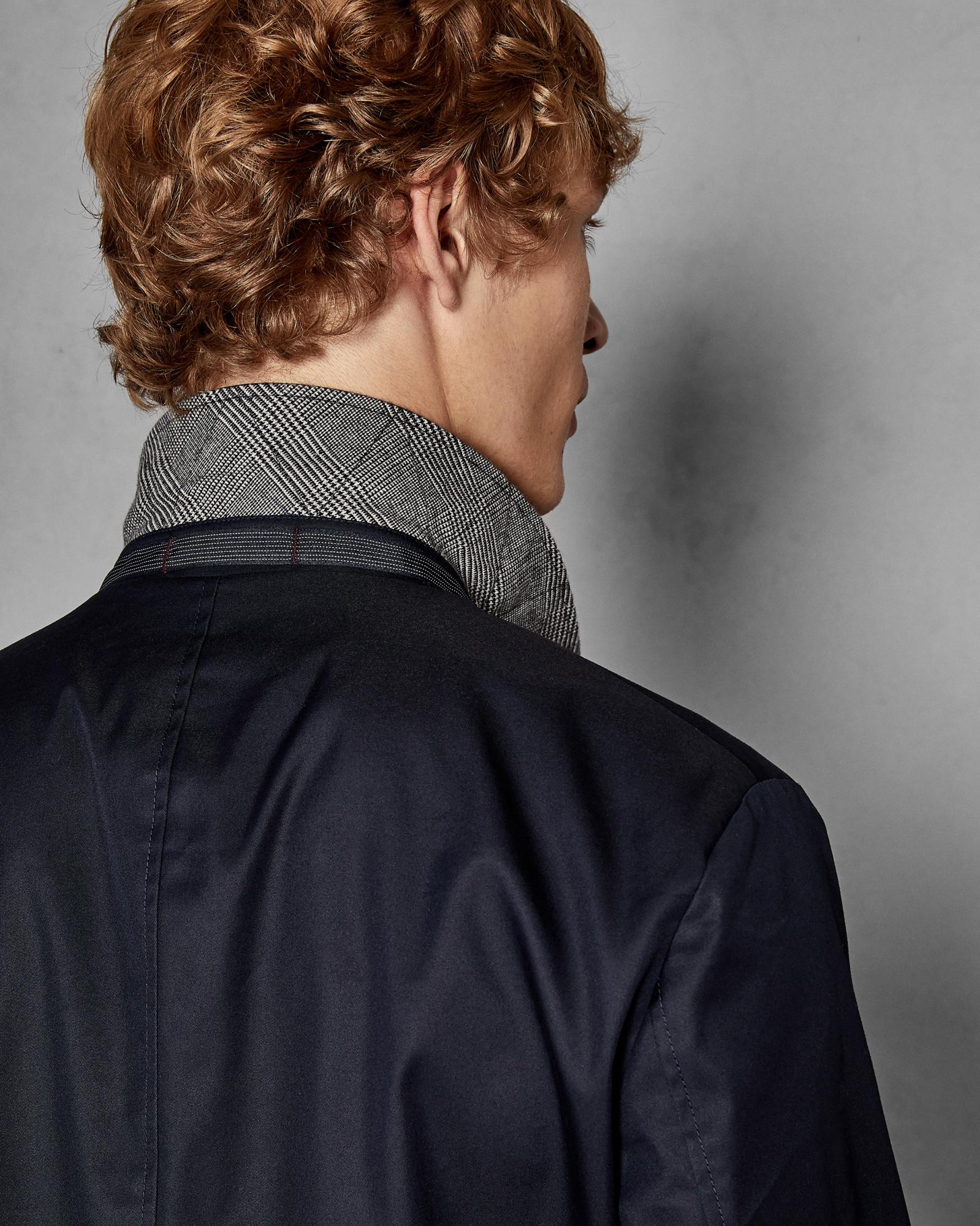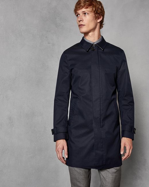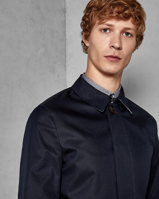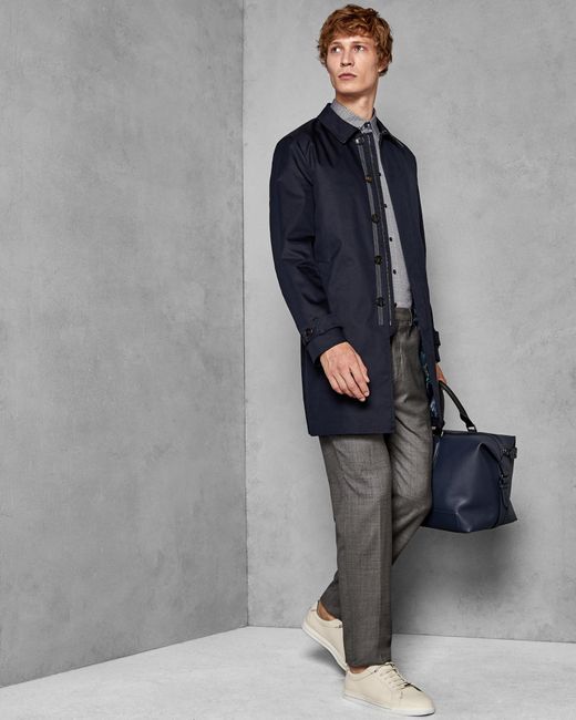 Mit Teds SPLASH Mantel sind Sie stilvoll gegen die Elemente gewappnet. Dieser Trenchcoat sorgt mit Zip-Verschluss, Knopfverschluss und Zierknöpfen an den Manschetten für ein elegantes Finish und lässt sich bei schlechtem Wetter perfekt zu jedem Ensemble kombinieren. Ted Baker Herrenkollektion. Langärmlig. Mit Kragen. Zip- und Knopfverschluss. Ted Baker Logo. Unser Model ist 1,87 m groß und trägt Größe 38R. Shell: 66% Cotton, 34% Polyester; Body Lining: 95% Polyester 5% Elastane; Sleeve Lining: 100% Polyester. Farbe: blau