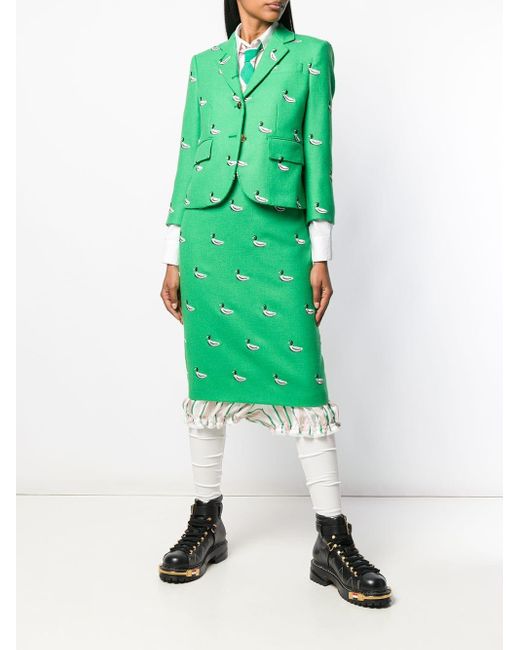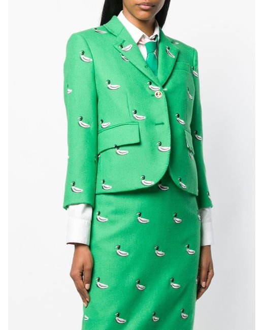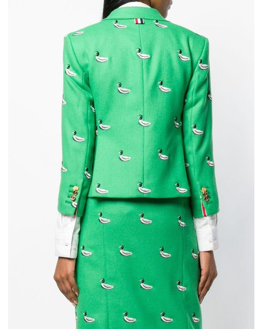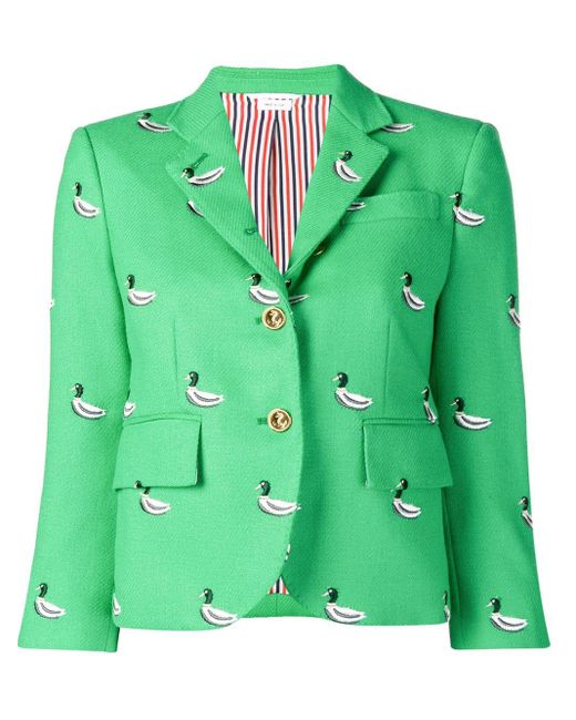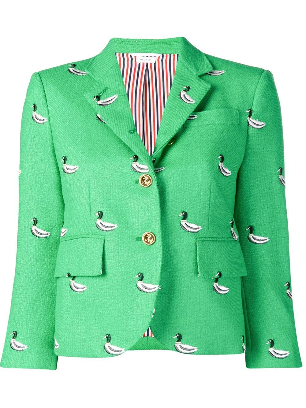 Blazer mit Entenstickerei von Thom Browne. Merkmale: fallendes Revers, Knopfverschluss vorne, eingefasste Brusttasche, Vordertaschen mit Klappe und gekürzte Ärmel. Farbe: grün