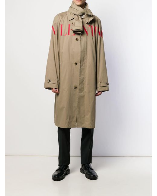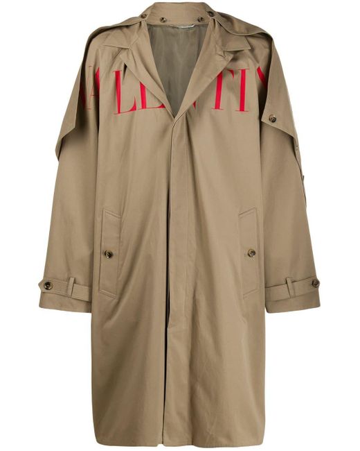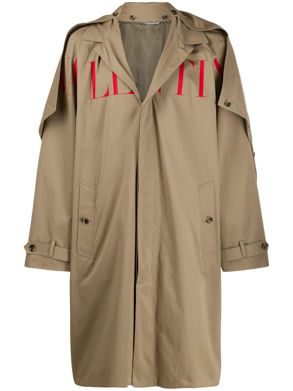 Trenchcoat mit Logo-Print von Valentino. Merkmale: klassischer Kragen, verdeckter Verschluss vorne, Regenblende, lange und weit geschnittene Ärmel, Manschetten mit Schnallen, seitliche Taschen und mittiger Logo-Print. Farbe: natur