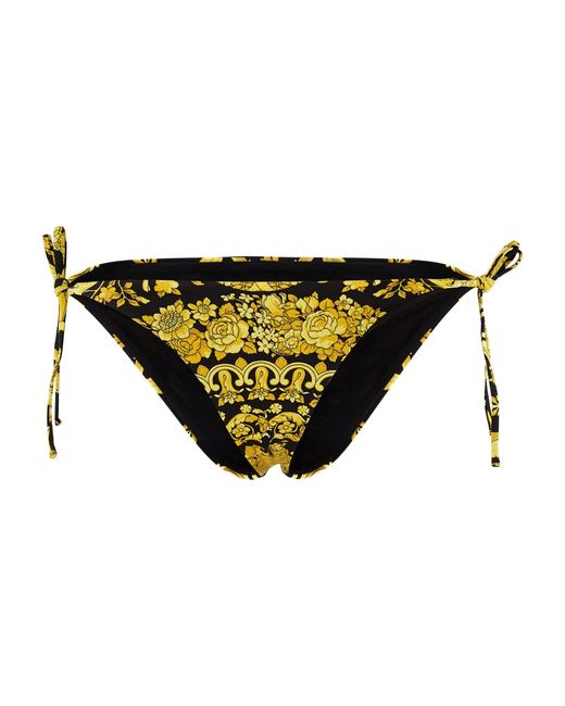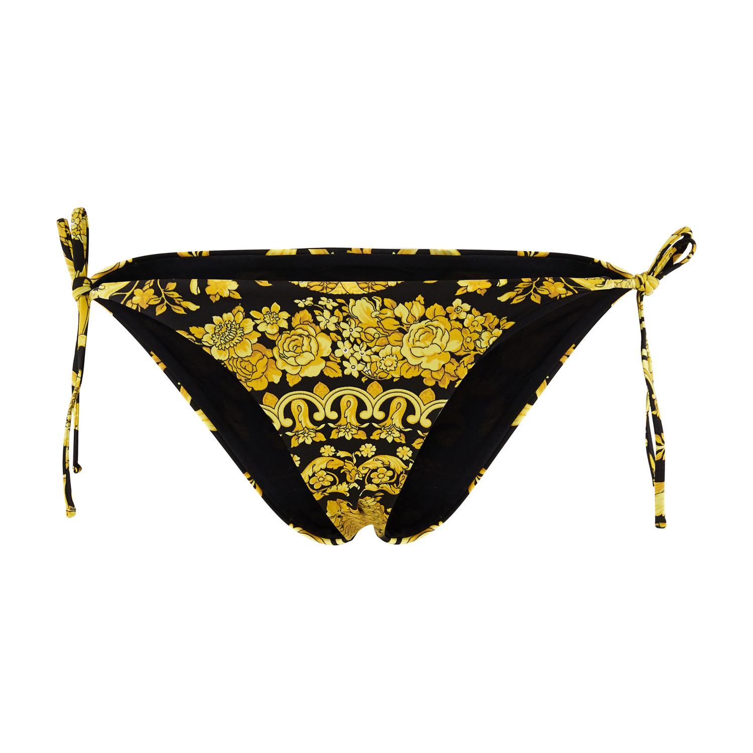 Dieser seitlich gebundene Bikini-Unterteil ist eine Kreation von Versace. Es ist mit dem für das italienische Haus typischen Barockmuster bedruckt. Ideal in Kombination mit dem dazugehörigen Oberteil. Farbe: schwarz