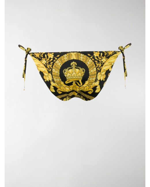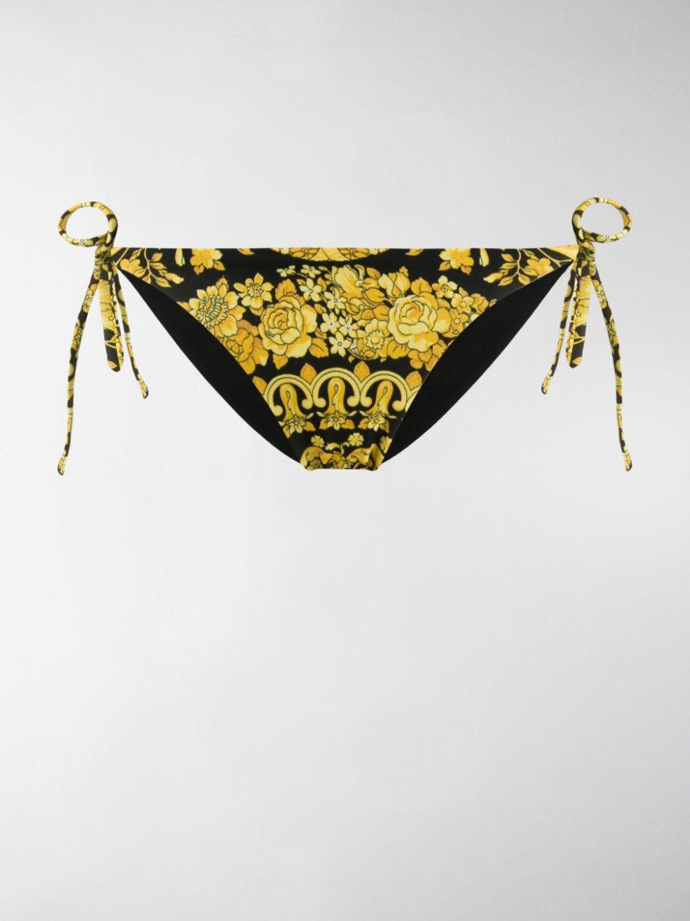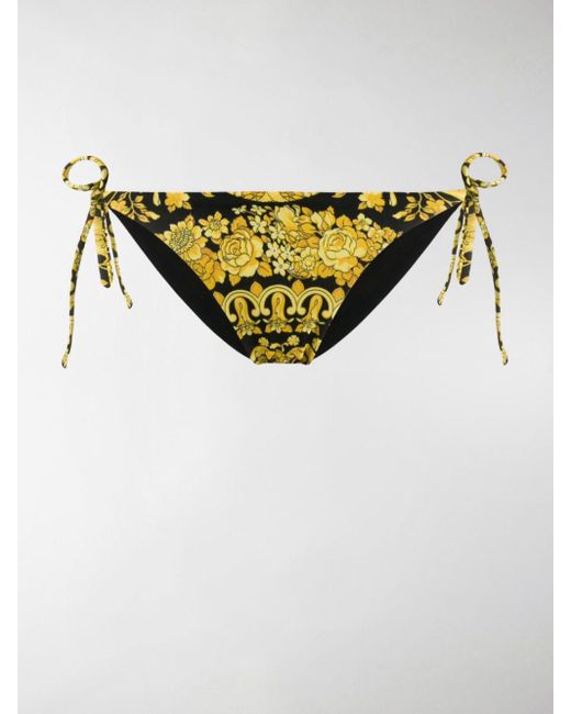 Bikinihöschen mit Rosen-Print von Versace. Merkmale: seitliche Schleifenverschlüsse und komplett bedruckt. Bademode darf nur über Ihrer eigenen Unterwäsche anprobiert werden. Farbe: schwarz