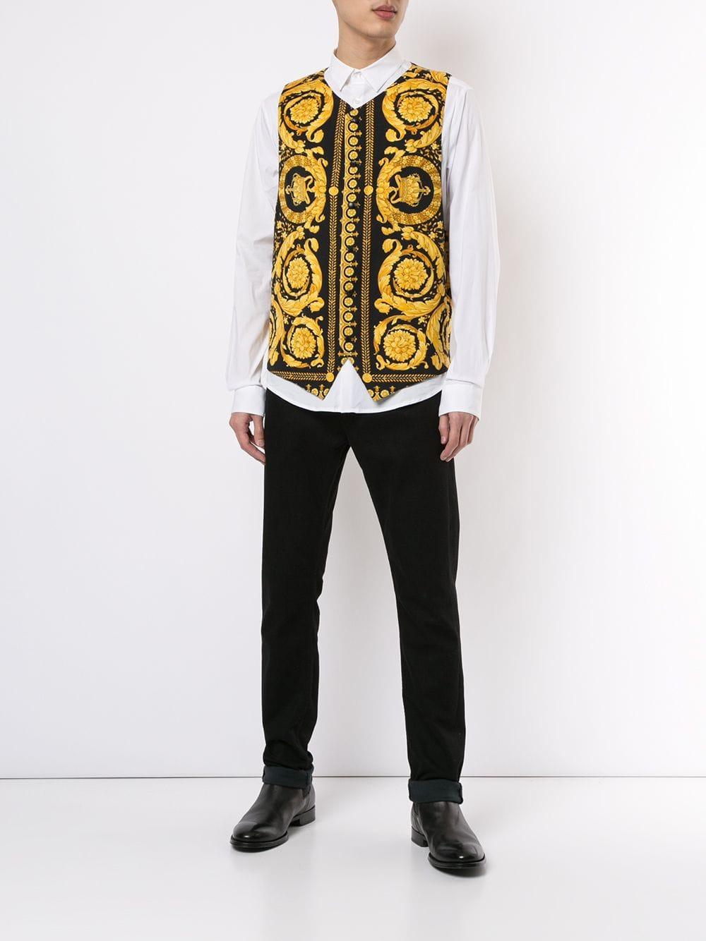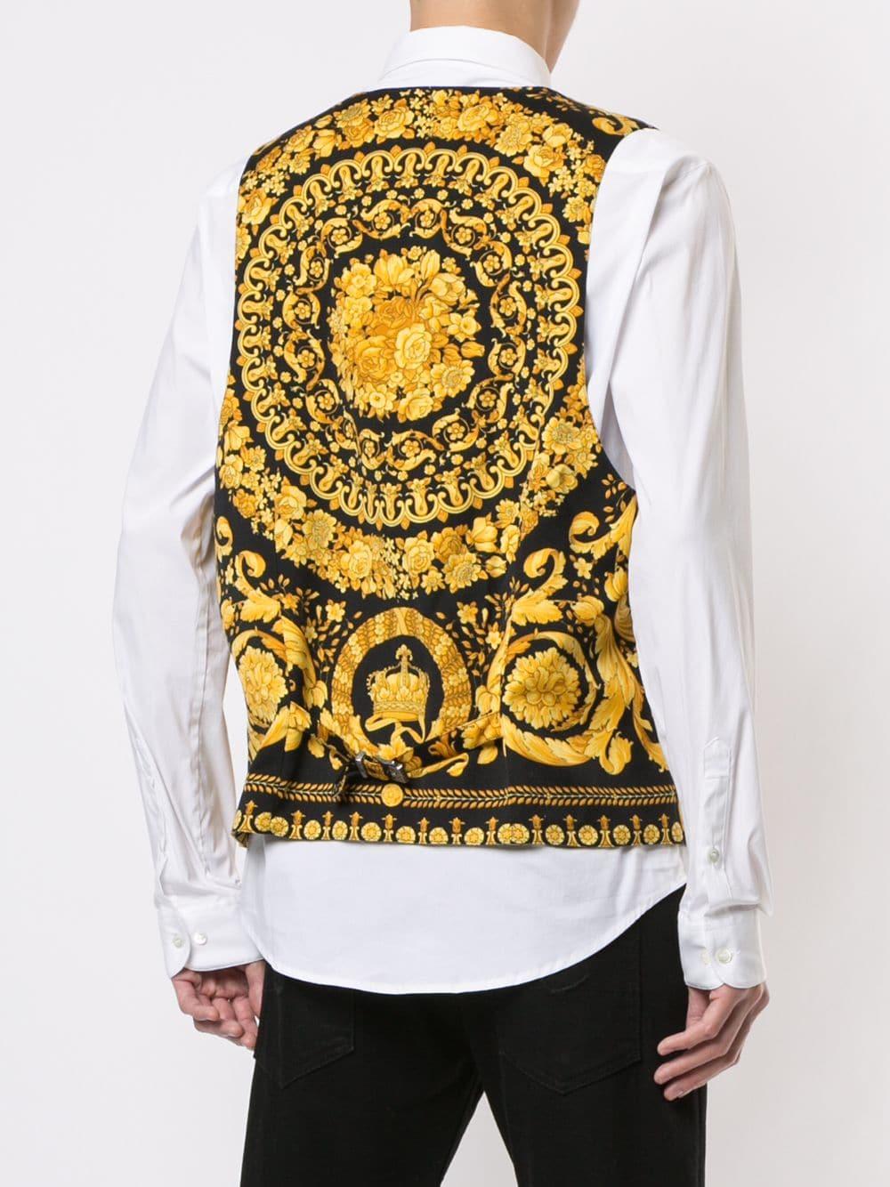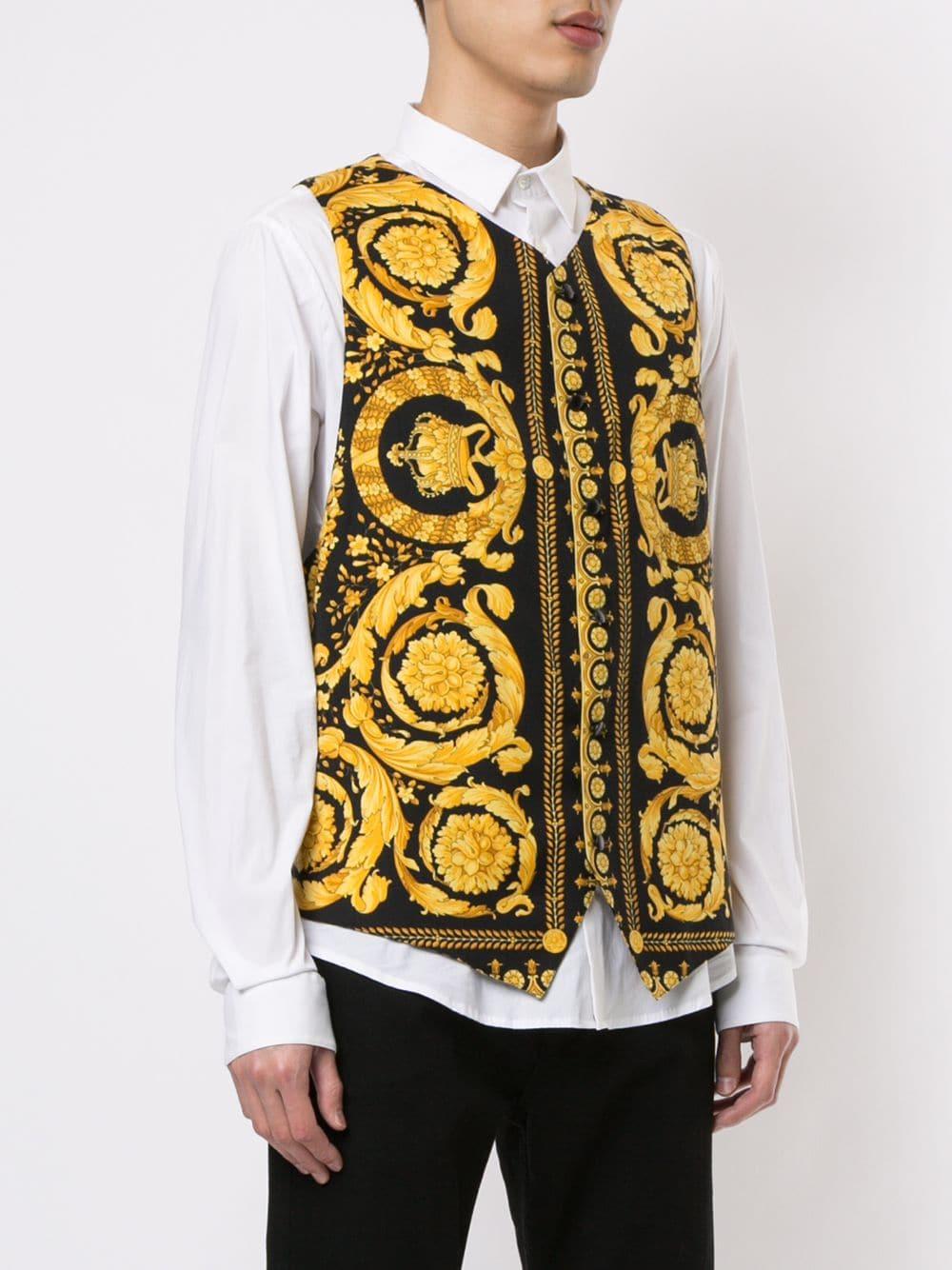 Weiter zu FarfetchWeste mit barockem Print aus Wolle von Versace Vintage. Merkmale: ärmelloses Design, V-Ausschnitt, Knopfverschluss vorne, Futter und asymmetrischer Saum. Bitte beachten Sie, dass dieser Vintage-Artikel gebraucht ist und deshalb kleine Imperfektionen aufweisen kann. Farbe: schwarz