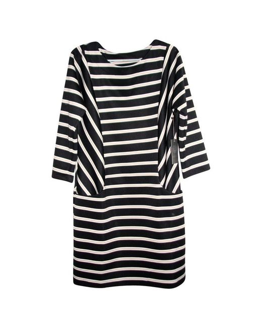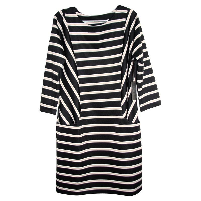 Atemberaubendes schwarzes Vince Camuto Kleid, neu mit allen Tags mit 2 Taschen und die Streifen sind ziemlich figurschmeichelnd und ergeben eine schlanke Silhouette. Das Material ist eine Polyster-Mischung mit 5% Elasthan, so dass es sich recht gut dehnt. Die Ärmel sind 3/4 Ärmel. Das Kleid ist schwarz, die Streifen sind in Creme und Beige. Kaufte es früher in diesem Jahr im Urlaub in New York im Vince Camuto-Laden an der 5th Avenue. Es ist ein wunderschönes Kleid. Schultern und Brust gehen in die Ärmel, die leicht fledermausgeschnitten sind. Farbe: schwarz