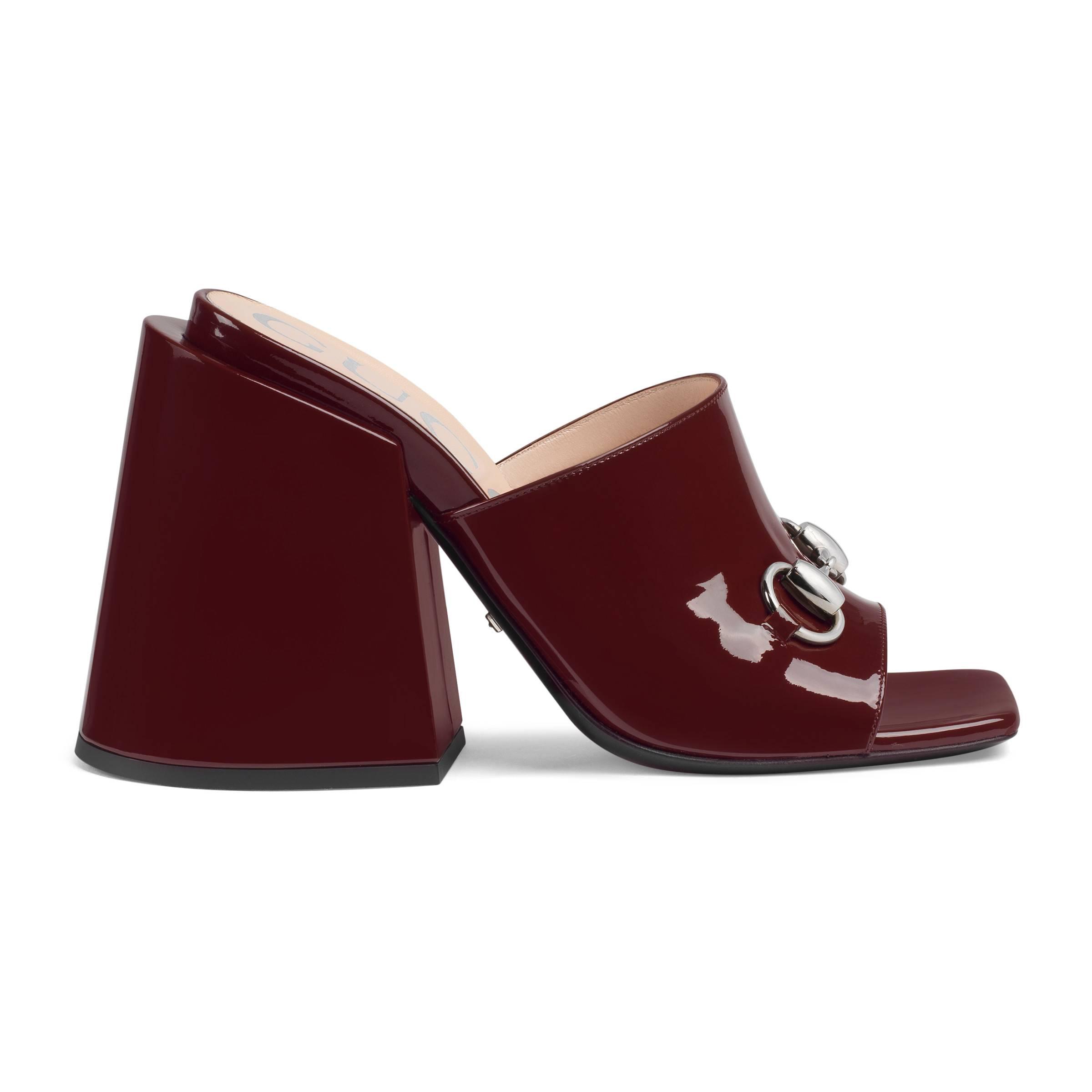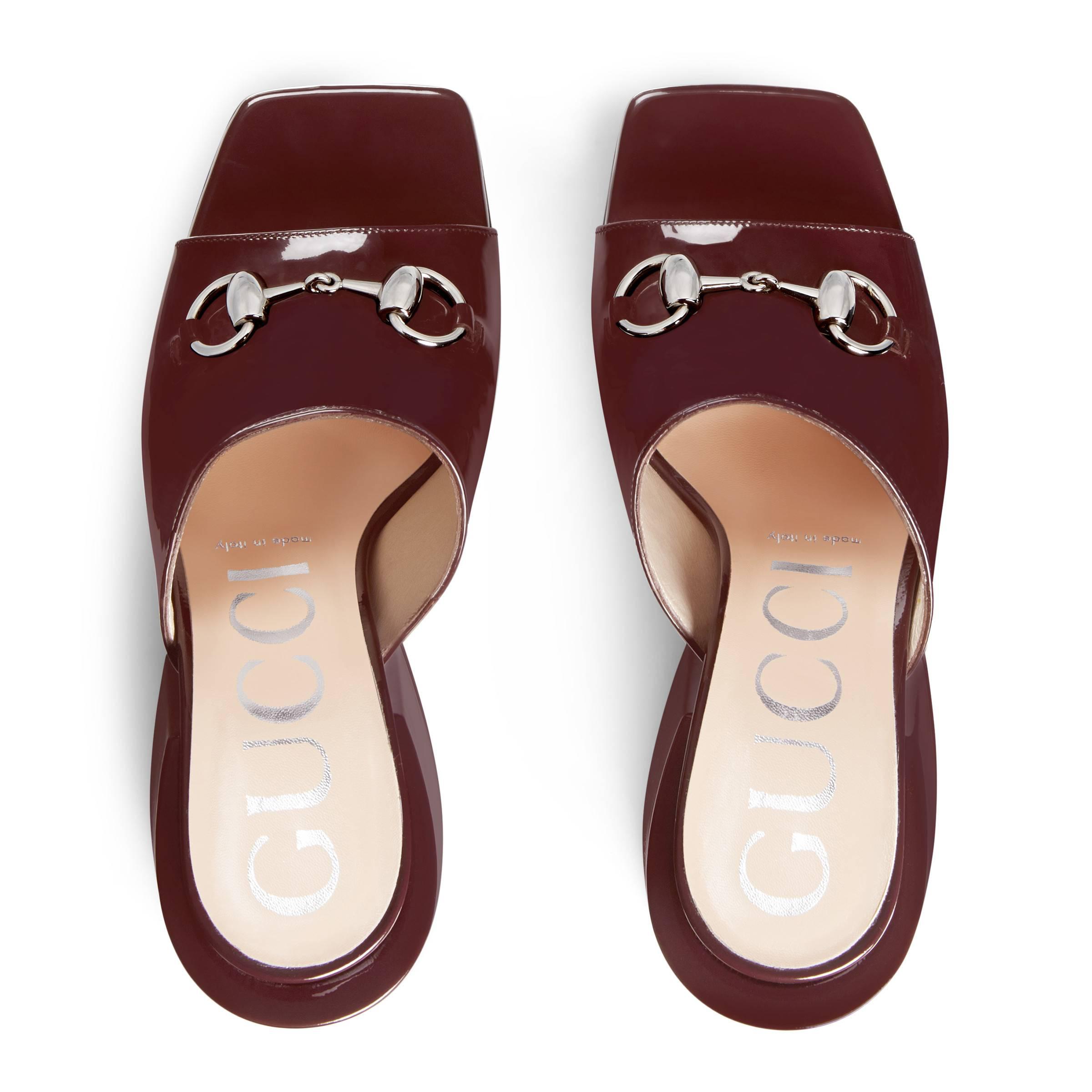 Weiter zu GucciDer kreative akt als ein dynamischer zusammenprall von stilen und einflüssen. Die revolutionäre vision hinter der herbst winter 2018 modenschau – die an einem ort präsentiert wurde, der metaphorisch an einen operationssaal erinnerte, – spiegelt sich in den unverkennbaren codes des hauses wider: diese kehren nun verwandelt, verschmolzen oder neu interpretiert in unerwarteten formen zurück in den mittelpunkt. Das klassische horsebit ist eine hommage an die welt des reitsports und prägt eine neue linie glänzender sandalen aus lackleder mit einem breiten absatz. Bordeauxrotes lackleder. Horsebit-detail. Futter aus leder mit gucci print. Breiter 105 mm absatz. Made in italy. Leder. Farbe: lila