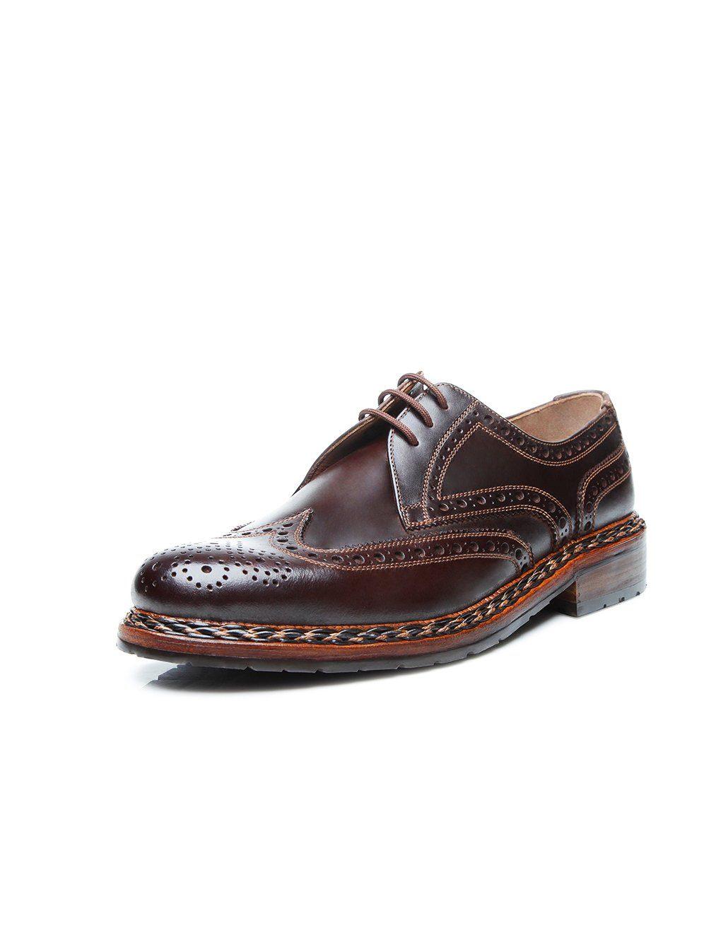 Modisch eleganter Full-Brogue Derby für Herren aus Fettnubuk von Heinrich Dinkelacker. Kennzeichnend sind die klassische Buda Leistenform sowie die Doppelsohle mit Gummiprofil und handeingeflochtenem Zopfrahmen. In aufwendiger Handarbeit in der Budapester Manufaktur von erfahrenen Meisterschuhmachern kreiert, verströmt Buda Full-Brogue H eine gewisse Nonchalance. In mehr als 300 Arbeitsschritten erhält der zwiegenähte Full-Brogue Derby eine Exzellenz, welche nicht nur optisch zu überzeugen weiß, sondern auch qualitativ den allerhöchsten Ansprüchen genügt. Buda Full-Brogue H ist der ideale Begleiter für die nasskalte Saison. Farbe: braun