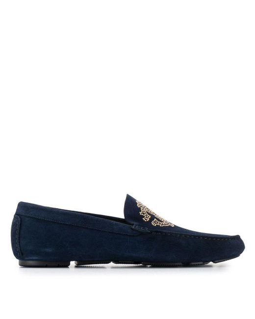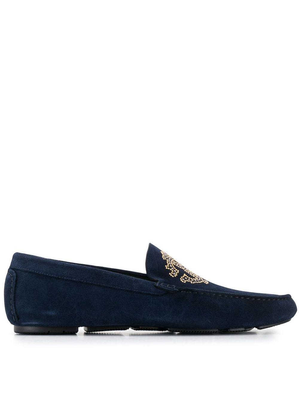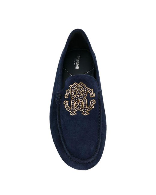 Loafer mit Logo-Verzierung aus Kalbsleder von Roberto Cavalli. Merkmale: zum Hineinschlüpfen, Fußbett aus Leder, mit kleinen Nieten besetzt und runde Kappe. Farbe: blau