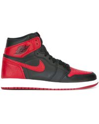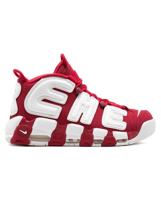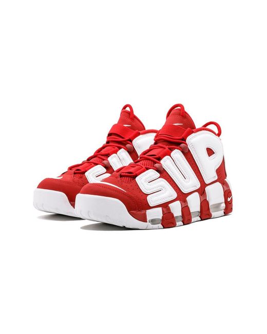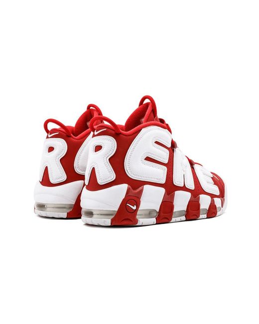 Rot-weiße 'Air More Uptempo' Sneakers aus Nubukleder von Nike mit folgenden Eigenschaften: mandelförmige Kappe, Schleifenverschluss und geprägtes Motiv. Farbe: rot