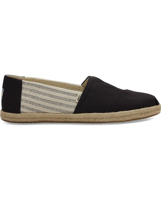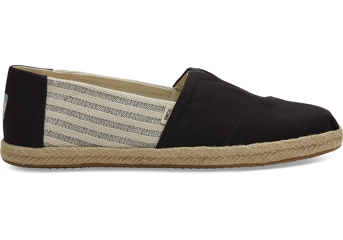 Unsere Classic Alpargatas aus schwarzem Canvas mit Gummisohle und Bastüberzug. Gestreifte Seitenbahnen und ein elastischer V-Einsatz machen den lässigen Slipper ideal für Schule, Arbeit und Freizeit. Klassischer Alpargata-Stil. Obermaterial aus Textil. Elastischer Zwickel für eine optimale Passform. Geflochtene Sohle Spezielle TOMS Gummilaufsohle. Für jedes verkaufte Paar Schuhe gibt TOMS ein Paar neue Schuhe an ein Kind in Not. One for One®. Schwarz Gestreifte Canvas Espadrilles für Herren. Farbe: schwarz
